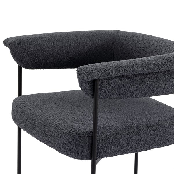 Airy and light with slim, black-finished iron framing, slate-colored performance boucle lends texture to a beautifully sculpted counter stool featuring a yoke back plus fold detailing. Easy to clean and made from fully recyclable materials, Fiqa fabrics are machine-washable, stain-resistant, water-repellent and antimicrobial.