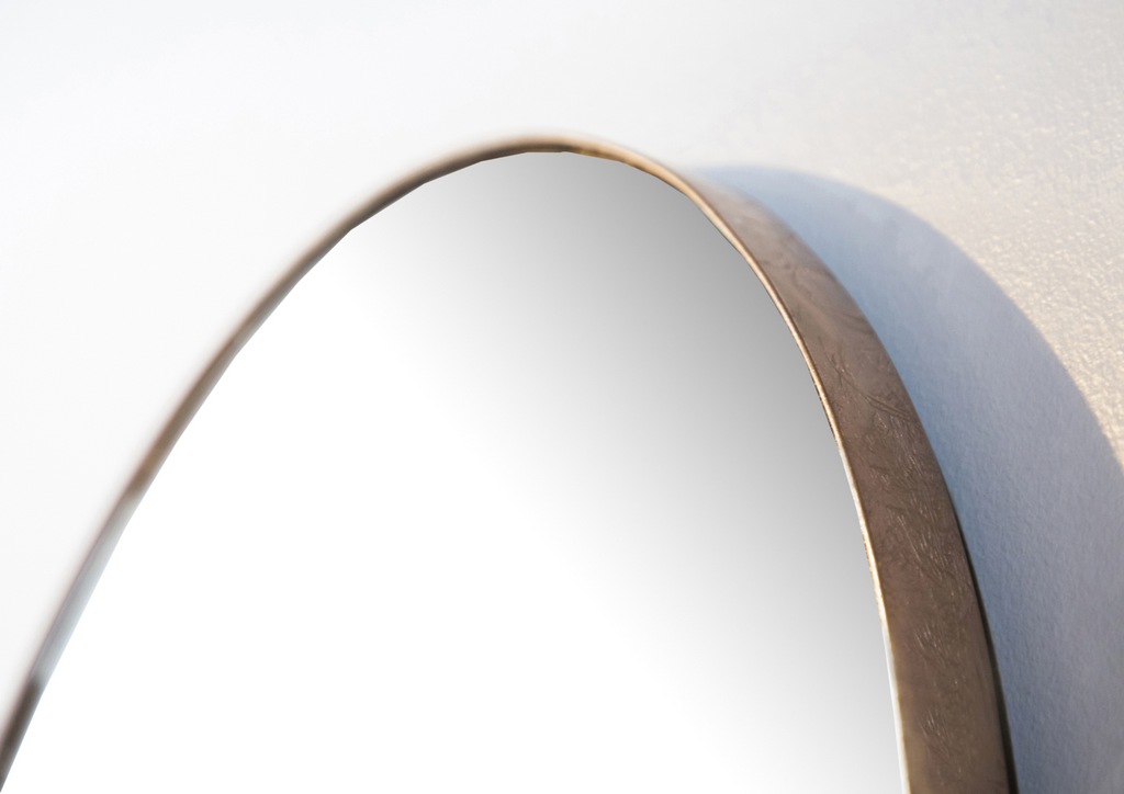 A rounded arched top mirror with a slim, gold metal iron frame.