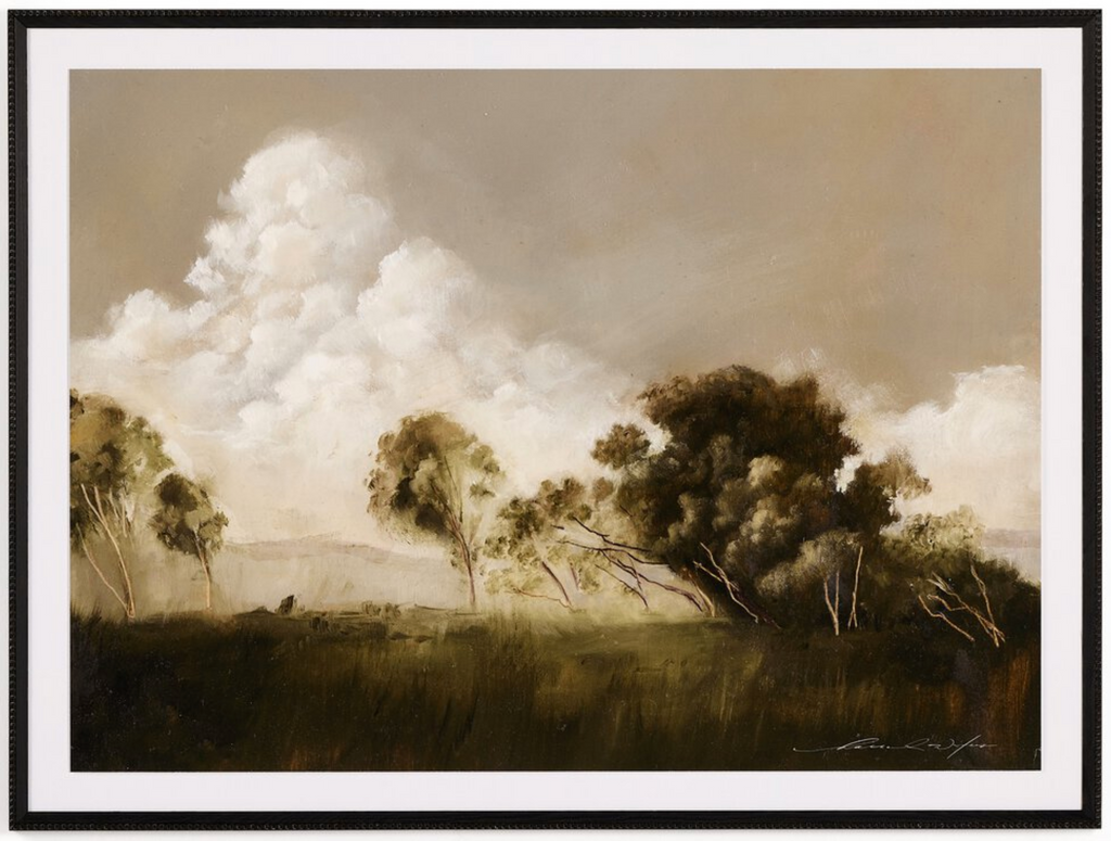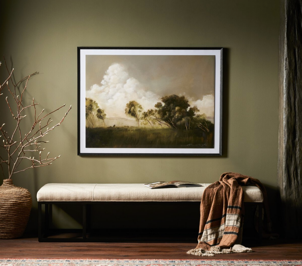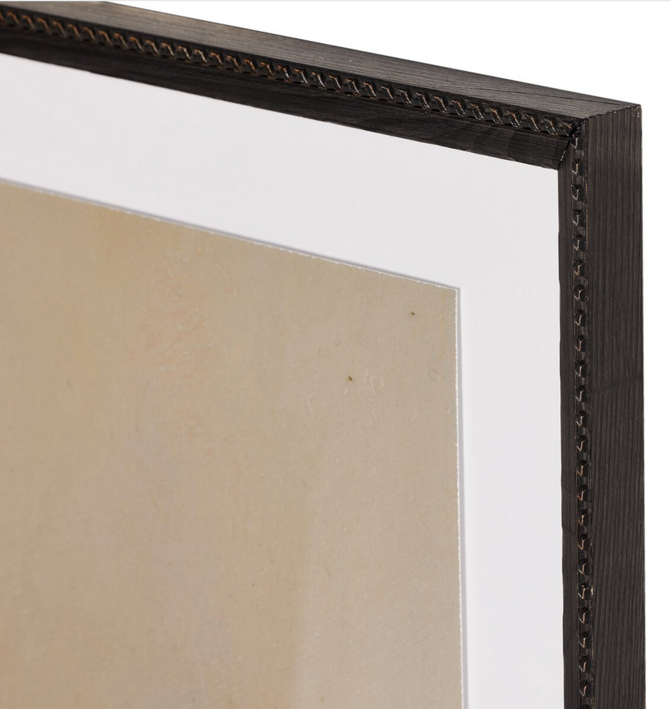 Alabama painter Hannah Winters finds inspiration in vintage landscapes, working with oil paint and an array of materials to texturize her ethereal pieces. Finished within a decorative Brimfield black frame of naturally distressed painted pine. Handmade in Austin, Texas.