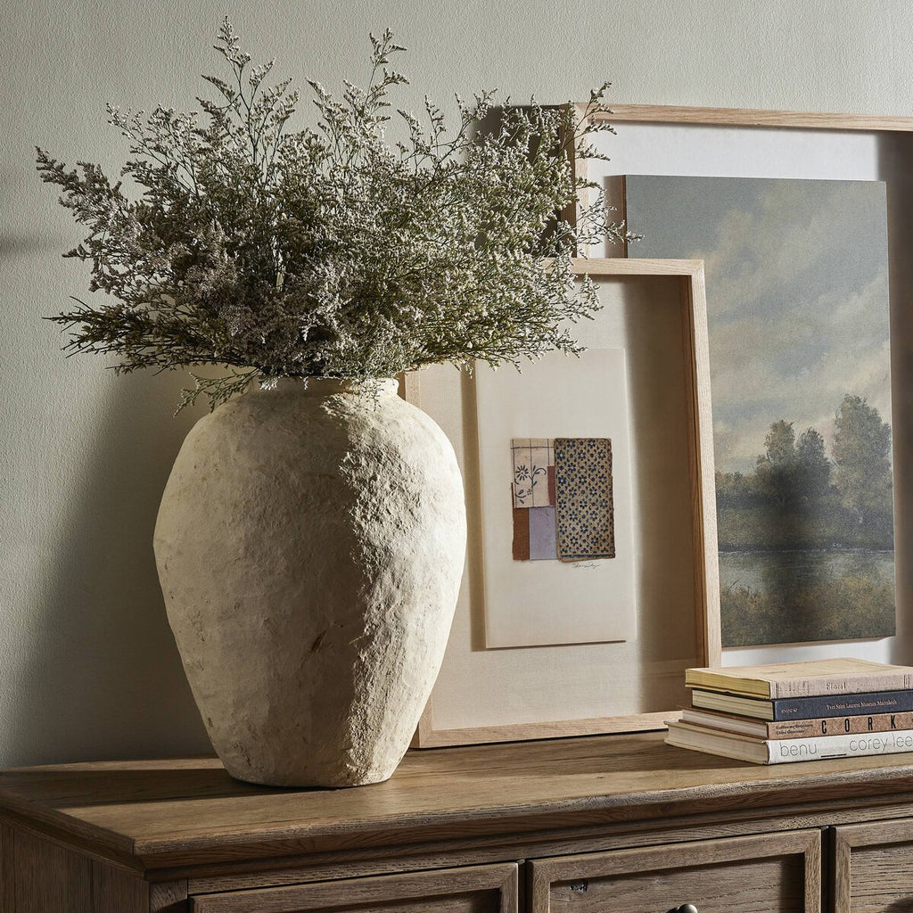 A bold vessel for faux indoor plants, finished with a narrow collar lip. Handcrafted from paper mache, each piece will vary slightly in texture, color and shape. Not water-tight; for decorative use only.