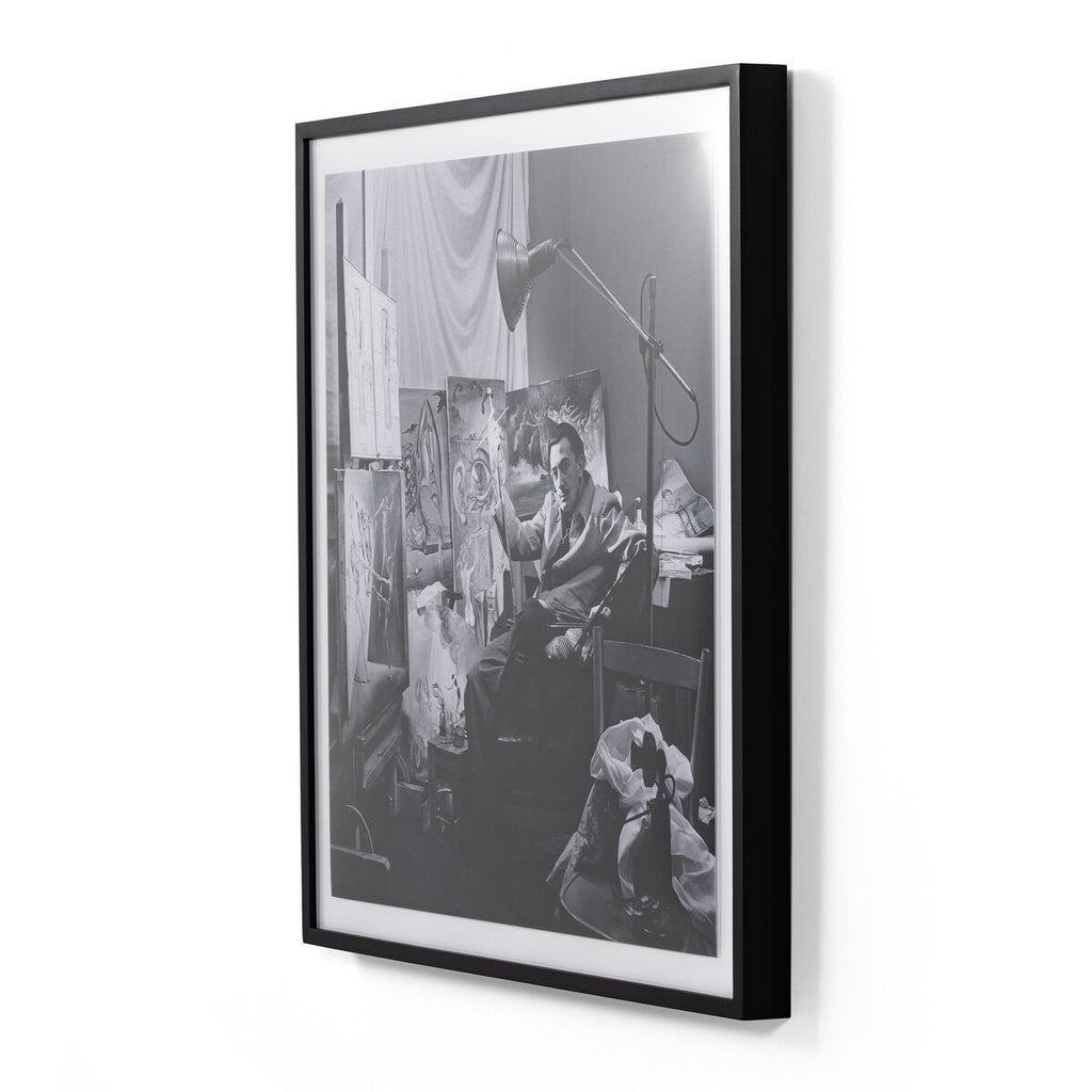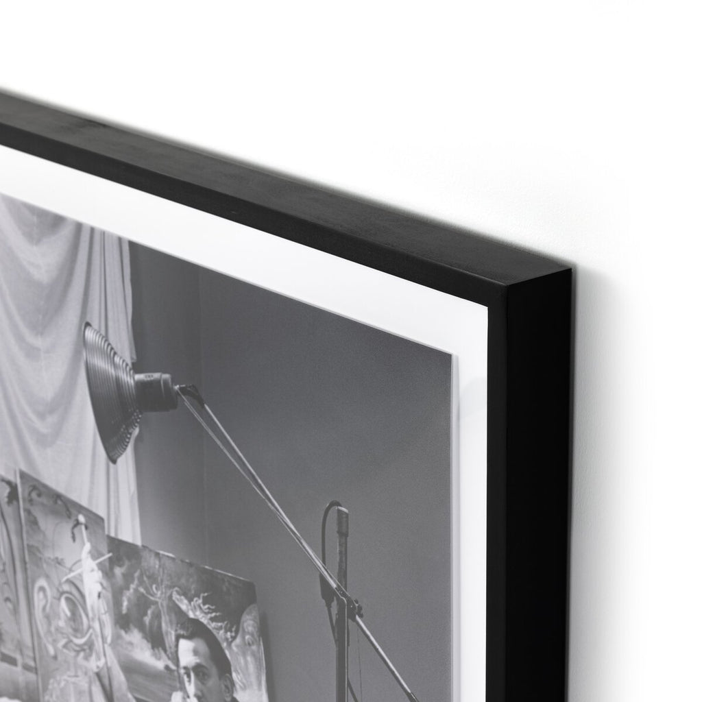 Spanish surrealist Salvador Dali in the studio. Float-mounted and framed within black-finished American maple for a museum-quality look. Handmade in Austin, Texas, each print includes a certificate of authenticity.