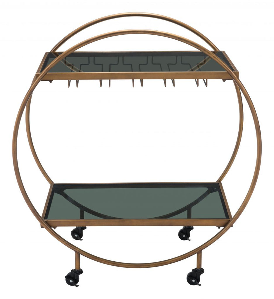 Build a home bar that's just as stylish as it is ideal for entertaining with this eye-catching cart. Founded atop four casters for easy mobility between the den and dining room, this piece features a circular frame crafted from iron with a gleaming light gold finish. Its two rectangular tiers offer a mirrored glass design, lending elegance to your display of liquor-filled decanters and serve ware so you can both serve and display.