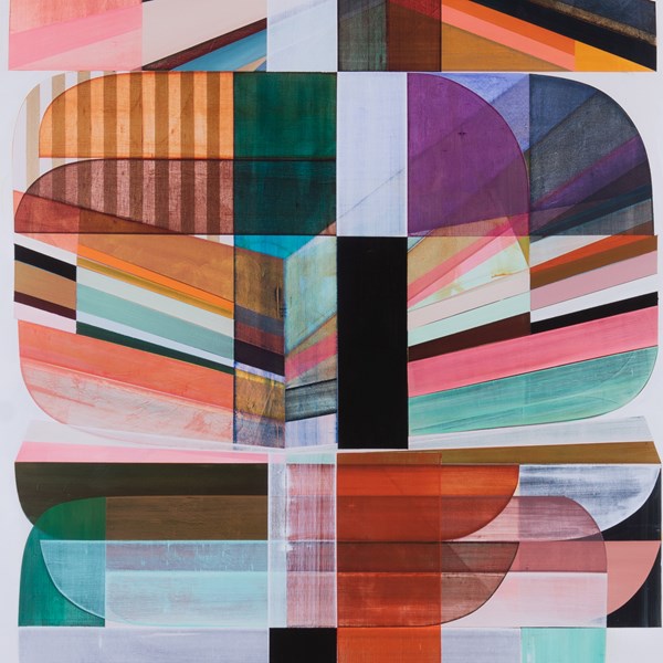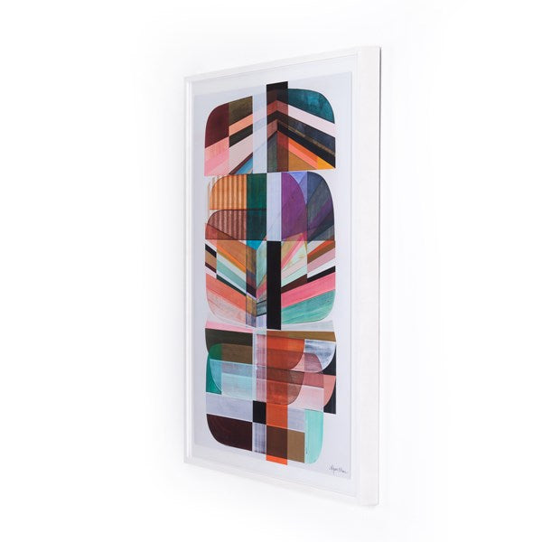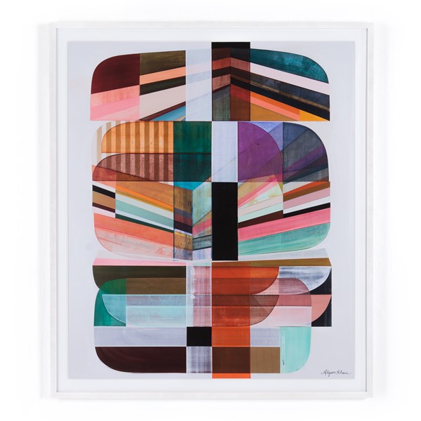 A colorfully complex, shape-driven rendering by Denver-based artist Alyson Khan is printed on watercolor paper and framed within white-washed maple for a museum-quality look. Handmade in Austin, Texas.