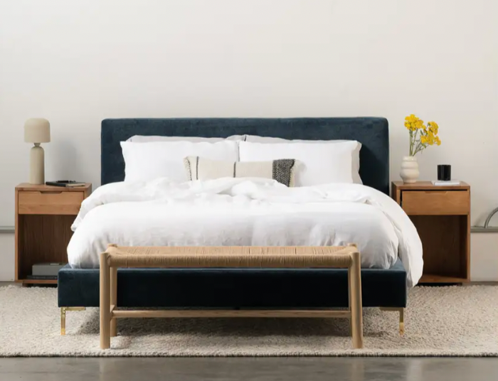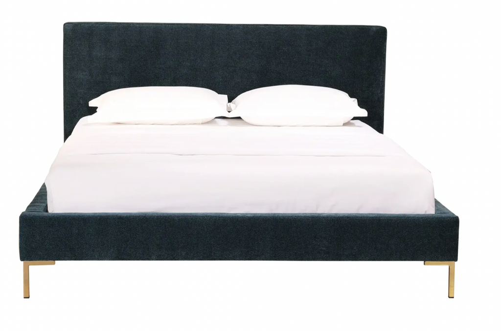 Fitted with clean lines and a solid pine frame wrapped in a midnight blue velveteen fabric, complete with a padded and upholstered headboard and golden leg accents. This contemporary modern King size bed is the sort of simple pleasure you need for a seriously stylish sleep.
