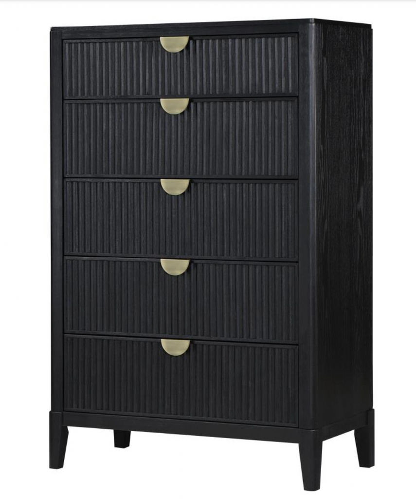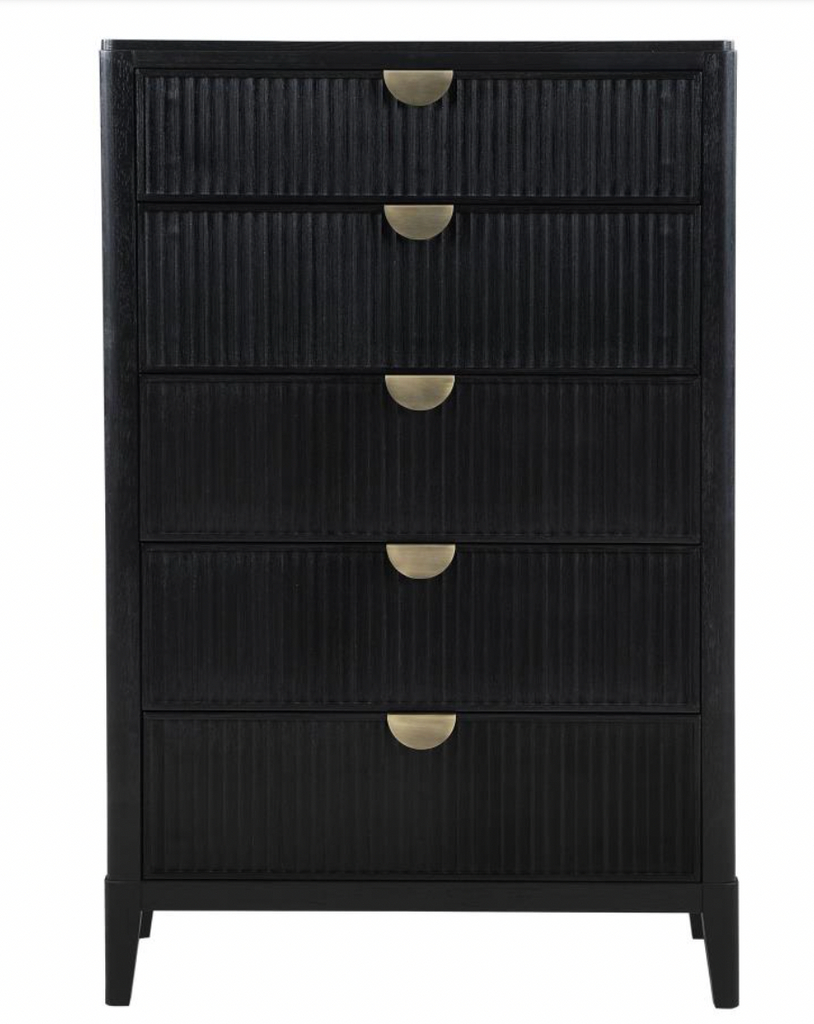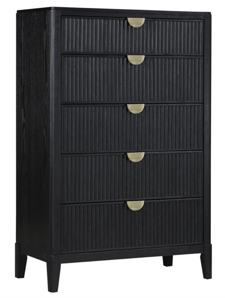 Stylish and modern, a contemporary wood chest features a wire brushed black finish