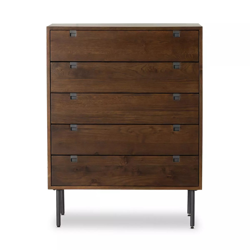 Style meets simplicity in this Danish-inspired design. Five drawers of solid natural oak welcome squared iron hardware in a gunmetal finish, bringing ample storage space to the bedroom.
