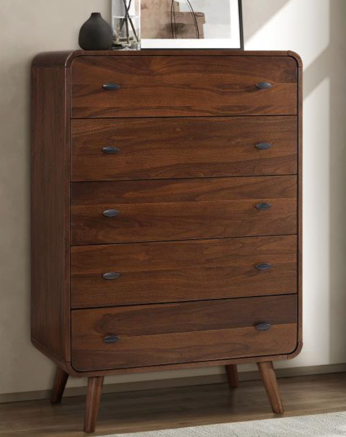 Mid-century modern style with rounded edges, dark walnut finish, and gunmetal hardware.  A smooth, rich, dark walnut finish adds warmth and depth to its design. Tapered, wooden legs flare out from its frame at an eye-catching angle. With six large drawers, it offers ample space to meet your storage needs.