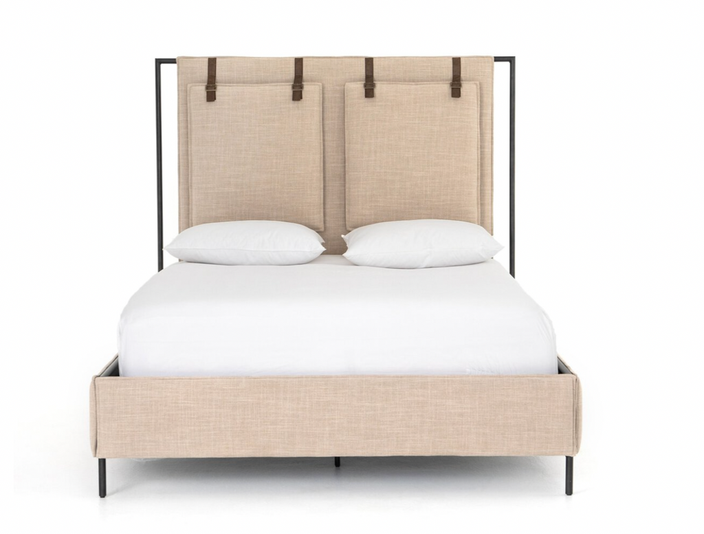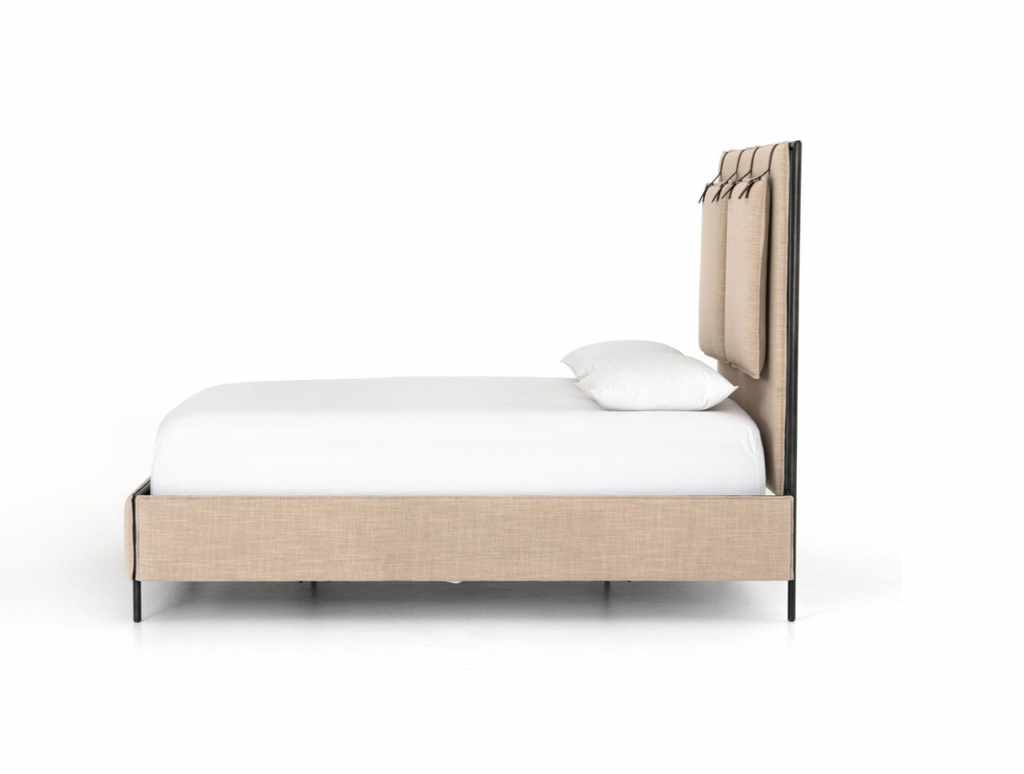 Safari styling gets a modern reboot. Linen-blend upholstery of neutral taupe lays a texture-rich base for a forward-thinking bedroom look. Brown leather straps secure decorative headboard pillows, suspended for eye-catching effect. Box spring required.