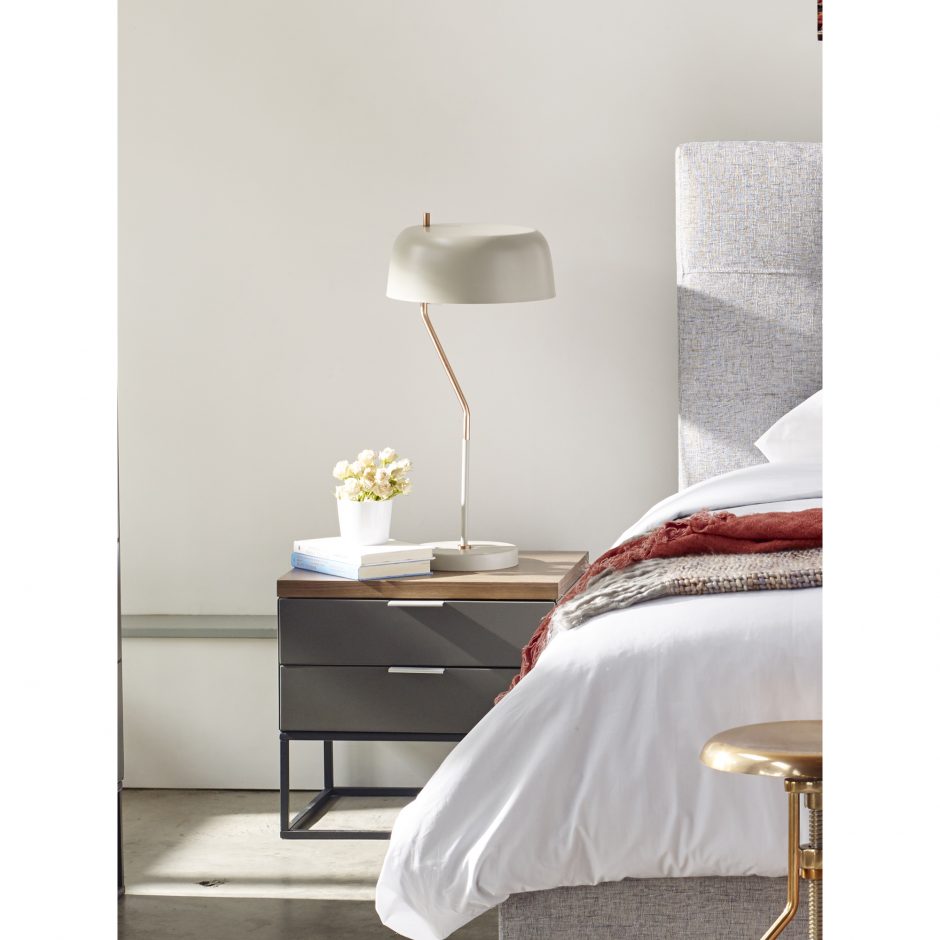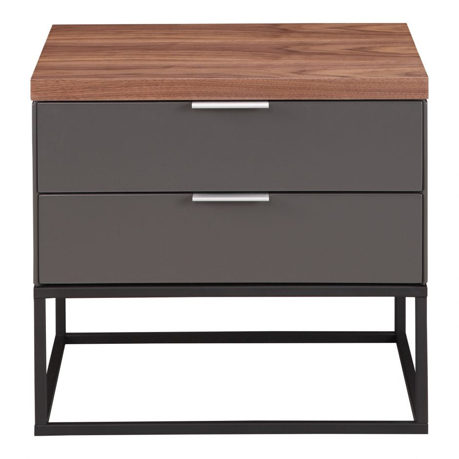 The natural walnut veneer top with a matte dark-grey finish creates warmth and durability, while the powder-coated metal base gives a light, clean look that balances the overall aesthetic. Two soft-close drawers provides effortless access to your important bedside essentials.