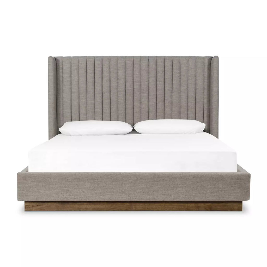 Sky-high style. A tall, vertical-channeled headboard is upholstered in grey high-performance fabric for a sensible take on modern bedroom styling. A parawood plinth base grounds the whole look. Performance fabrics are specially created to withstand spills, stains, high traffic and wear, ensuring long-term comfort and unmatched durability. This bed is not compatible with an adjustable mattress.