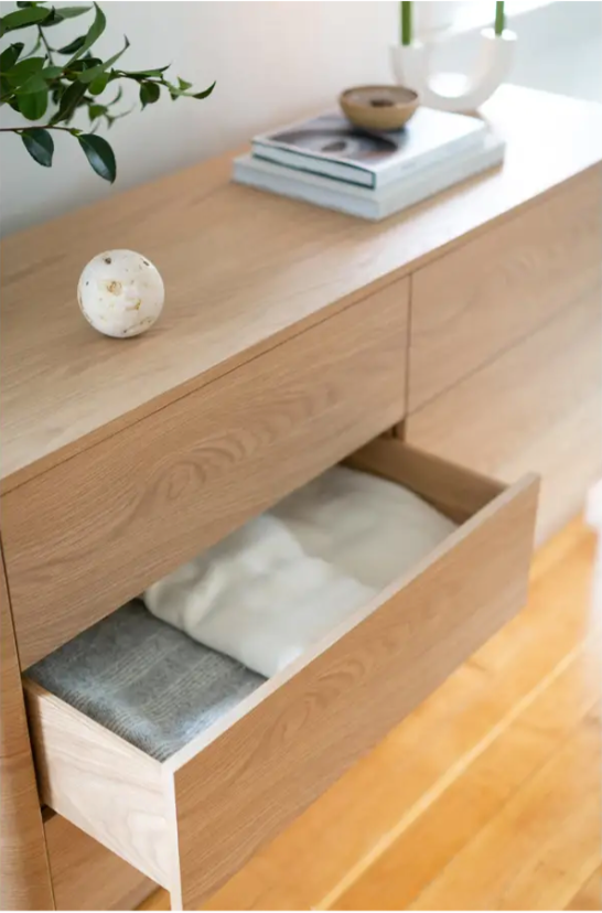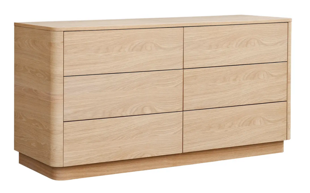 A soft, natural look for your bedroom. The Round Off collection is a showcase of organic appeal, with the beautiful pale tones of the grain matched to a simple, comforting design. This dresser features a low build and softly rounded corners, with plenty of room for personalized styling across its top. Six drawers glide open to reveal plentiful storage space for your favorite clothing. As part of the Round Off bedroom collection, pair with the nightstand and bed for the complete look. Natural beauty and character come together to promote mellow relaxation in the most personal room of your home.