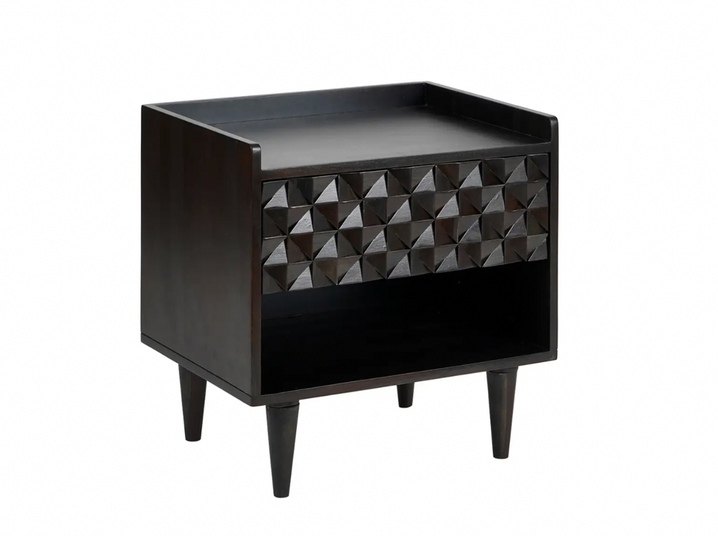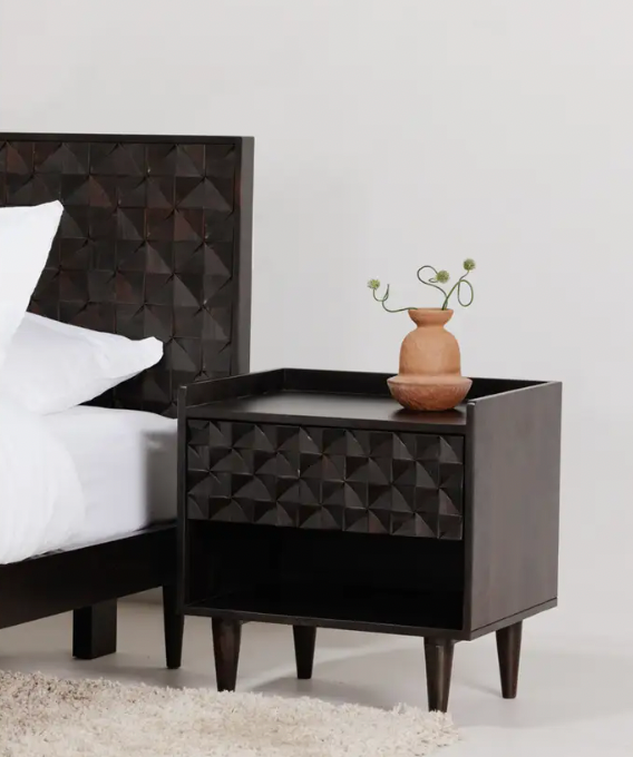 Crafted in solid Sheesham wood with a black finish, the Peter nightstand features an intricately designed front with each piece carefully arranged by hand. A single drawer with a safety stop provides ample storage, while a finished back allows this piece to float through the bedroom space.
