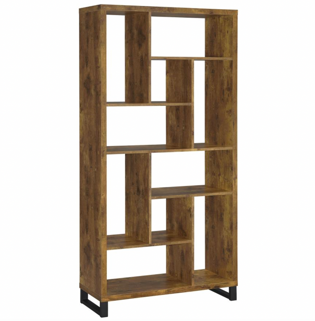 Bookshelf with alternating square and rectangular open compartments. Rustic nutmeg finish with black metal base for industrial appeal