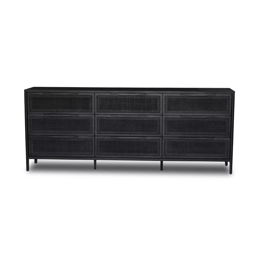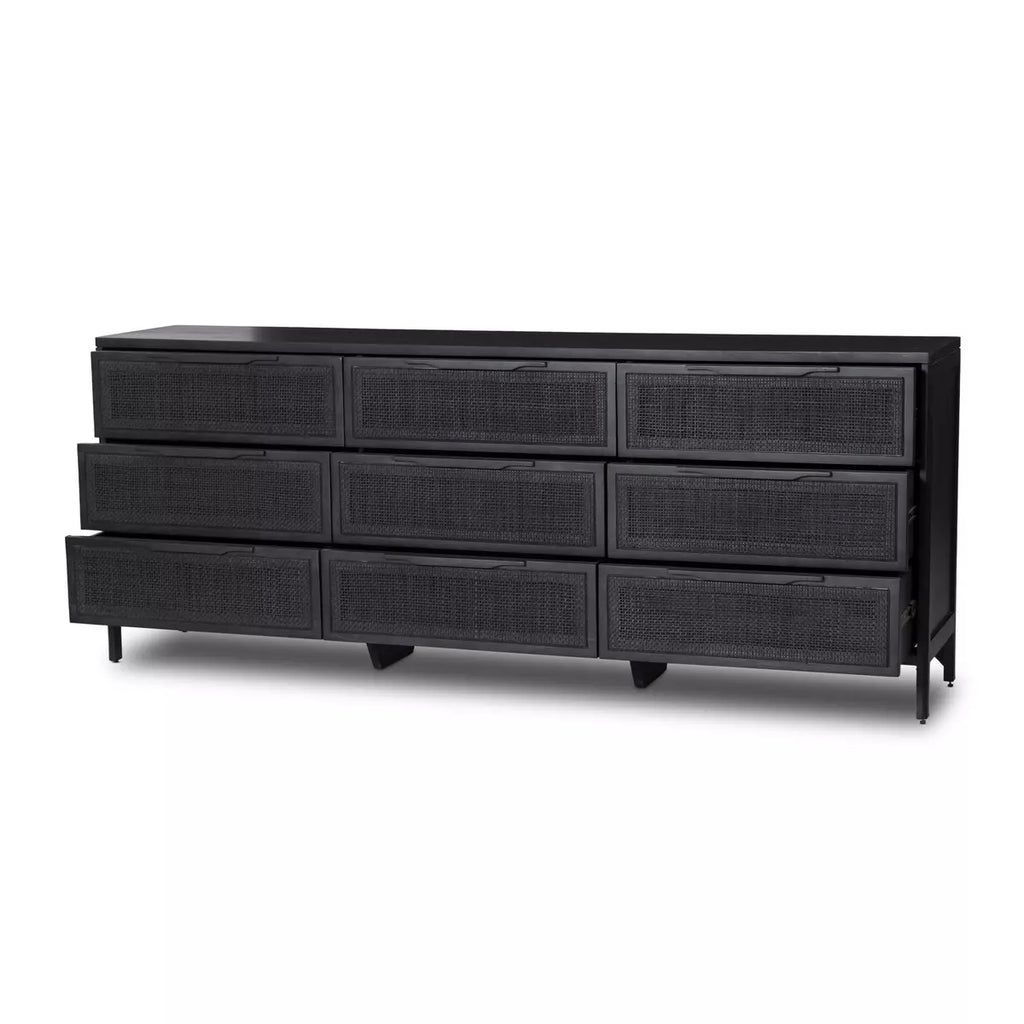 Black-finished mango encases nine spacious drawers of woven black cane, for a textural, monochromatic look.