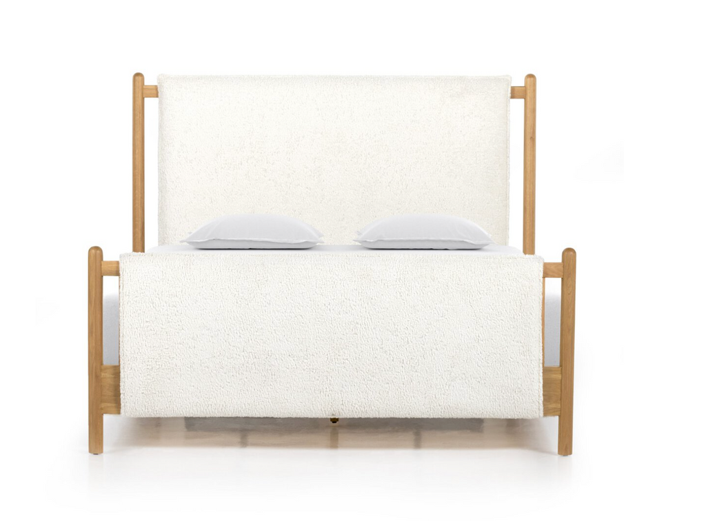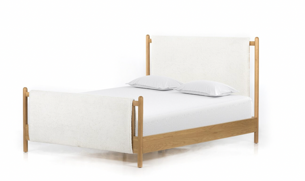 Bring a cozy hygge vibe to the bedroom. Framed by light-finished solid oak, a sling-style bed features faux shearling head and foot boards, for welcoming warmth and trend-forward texture alike.