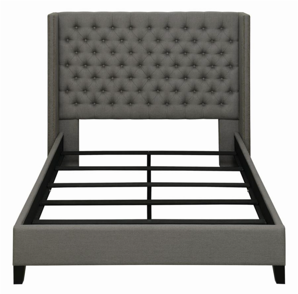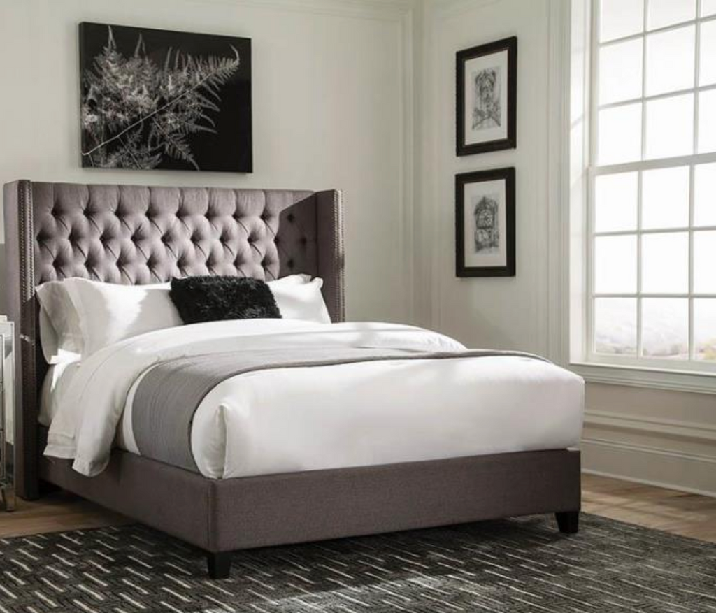This bold upholstered grey bed with modern button tufting is a stunning statement piece for the bedroom.