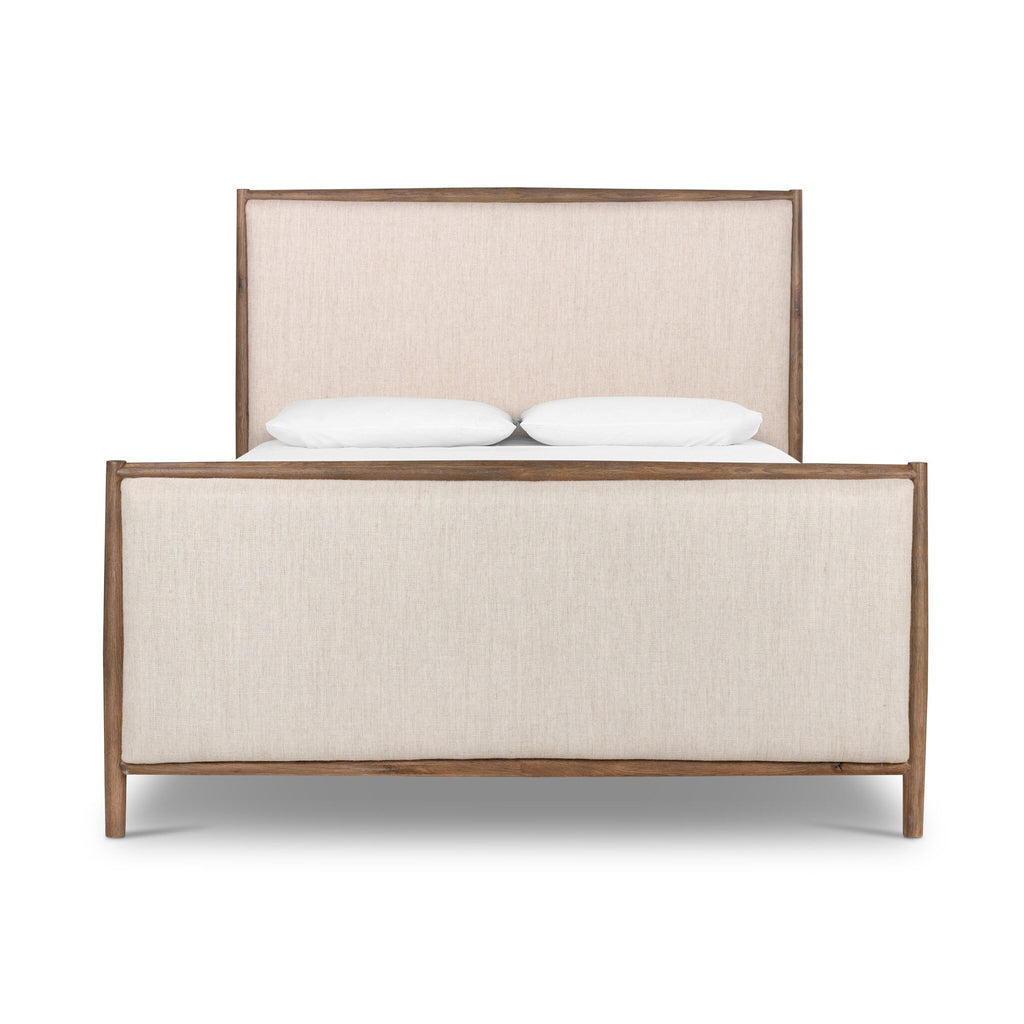 Weathered oak and light, linen-like upholstery fuse for a new take on traditional.