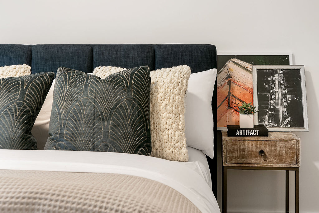 With a frame constructed from rubber wood and plywood, this bed features a headboard upholstered in a blue fabric with channeling. Solid rubber wood legs and an exposed wooden frame in a walnut finish complete the look. A box spring is not required for this bed.