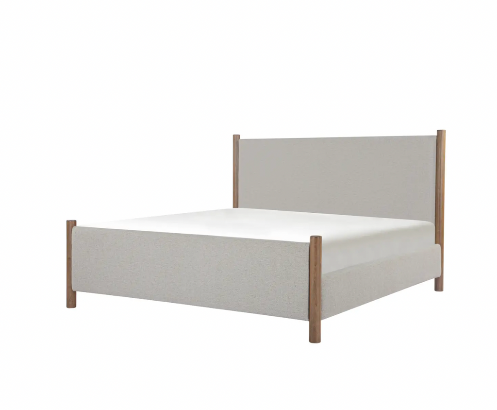Classic four-post bed. Soft textured fabric upholstery pairs with rubberwood legs with midtown brown stain finish.