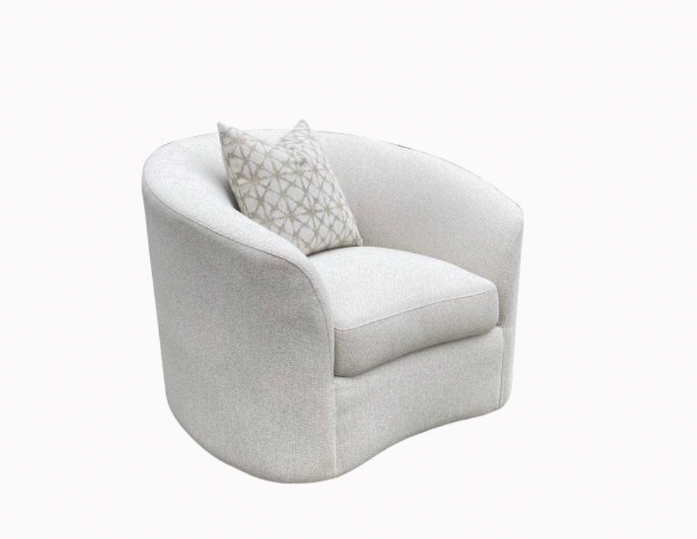 A contemporary lounge chair upholstered in a neutral latte-finished boucle fabric throughout its contoured silhouette and curved sloped armrests.