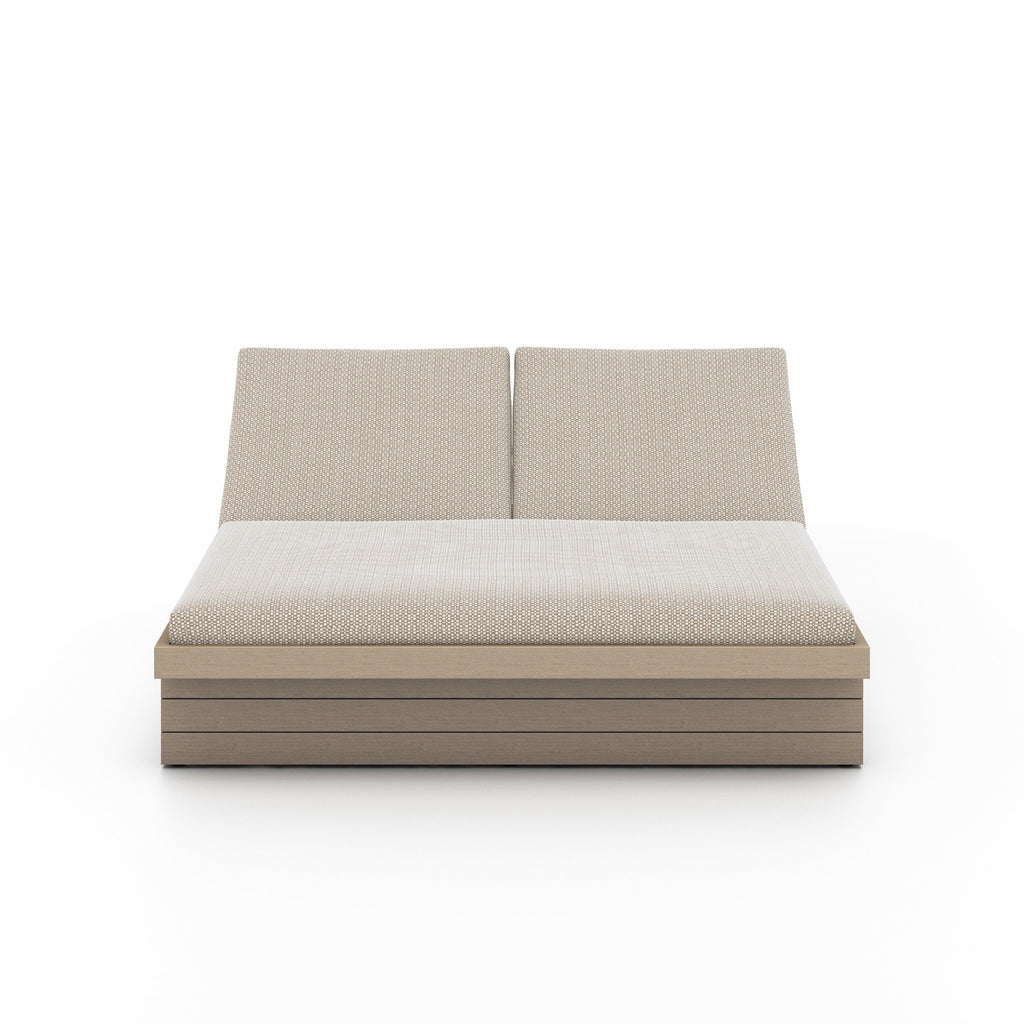 Recline in style, indoors and out. Finished in a washed brown, FSC-certified teak forms an adjustable double frame for UV-resistant and water-repellent cushioning in a sandy tan, with rear rope detailing for added dimension. Clever split back allows for varied recline angles. Cover during inclement weather and when not in use.