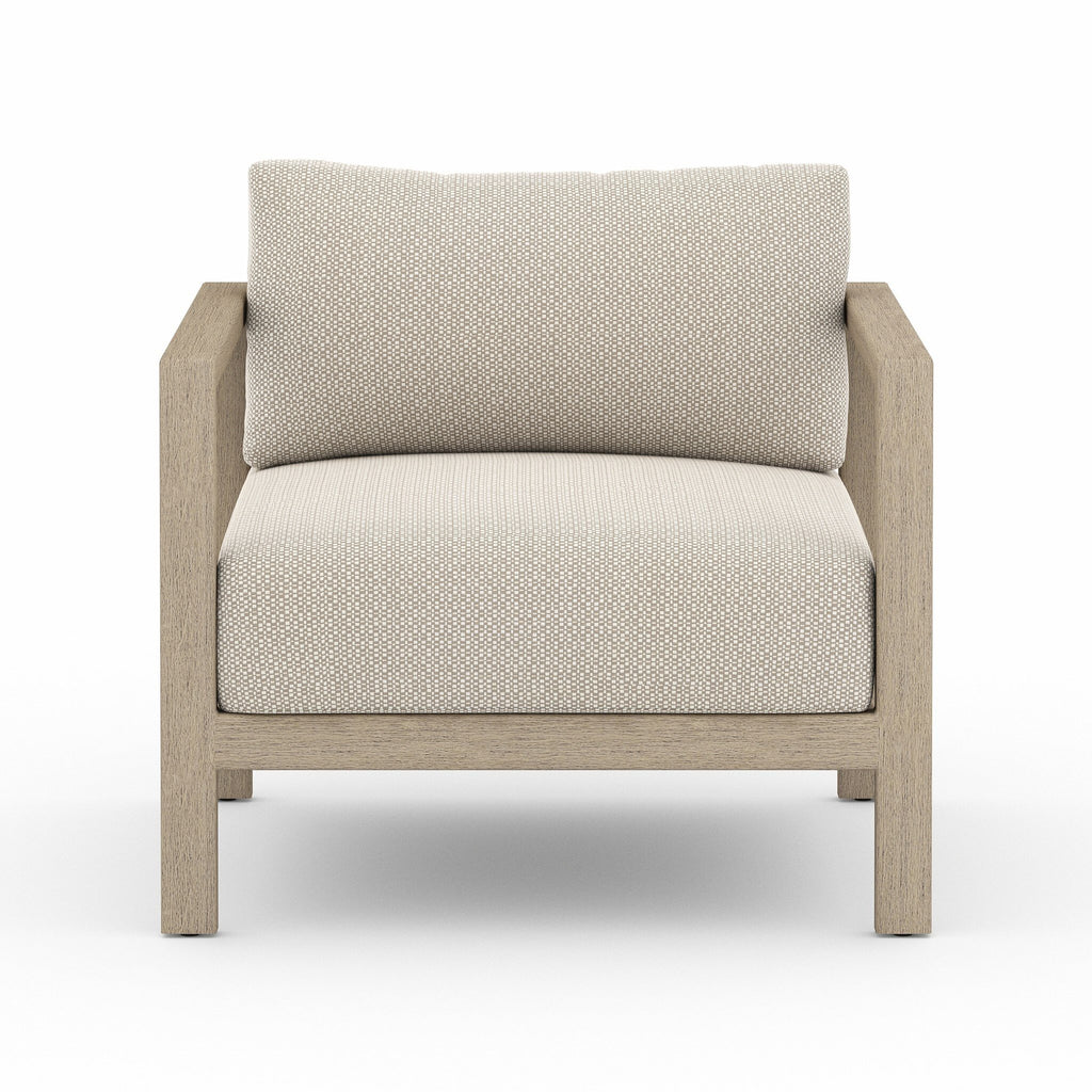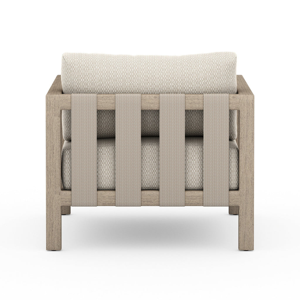 Solid FSC-certified teak forms a clean frame for UV-resistant, water-repellent Sunproof fabric. Neutral back straps add intrigue. Cover or store indoors during inclement weather and when not in use. Our Weatherproof Outdoor Chair Cover in size medium fits this chair.