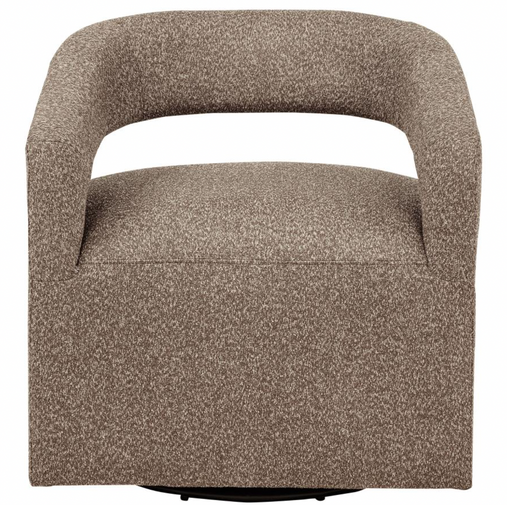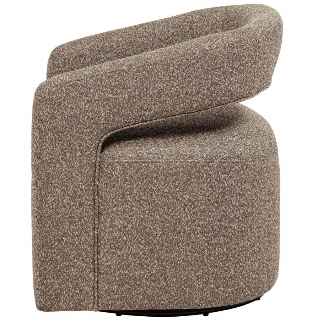 Curved form meets effortless movement in this modern swivel accent chair.  Upholstered in textured boucle and built on a hidden swivel base, it glides smoothly to support dynamic living.