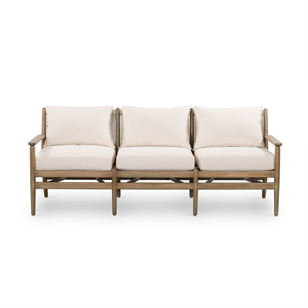 Made with FSC®-certified eucalyptus, tapered legs and paddle arms lend a slim, shapely look to outdoor-friendly sofa seating with durable, Velcro-secured box cushions in a versatile ivory. Linear rope detailing on back adds novel texture. Cover or store indoors during inclement weather and when not in use.