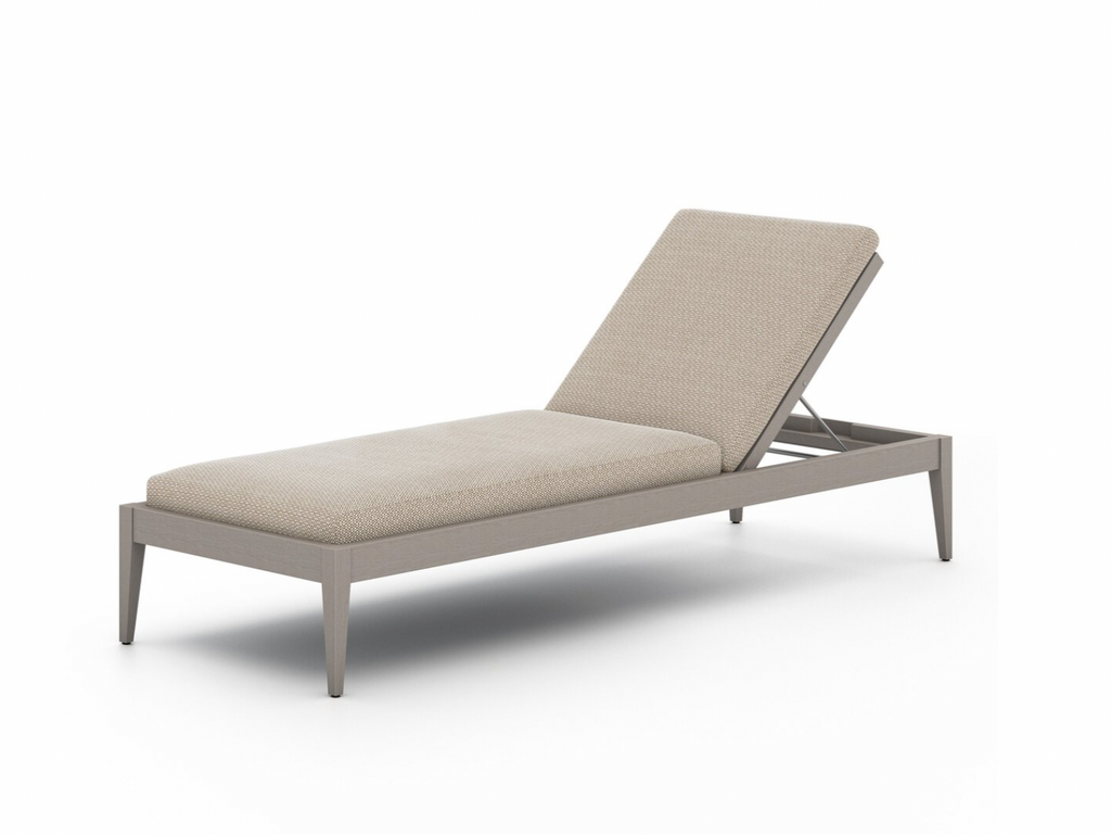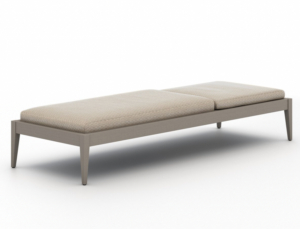 Modern materials ready a stylish silhouette for outdoor lounging. FSC-certified teak forms a clean frame for UV-resistant and water-repellent fabric in an invitingly neutral hue. Cover or store indoors during inclement weather and when not in use.