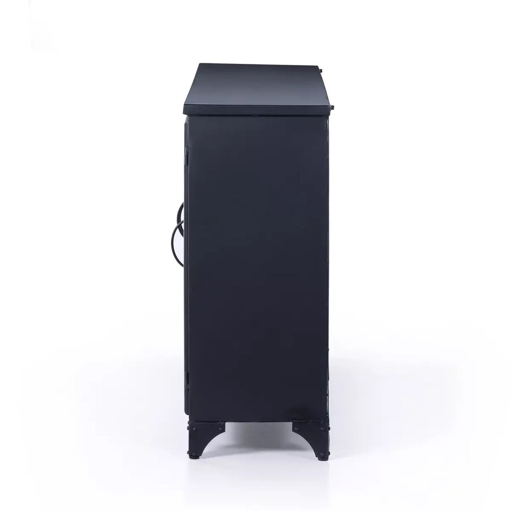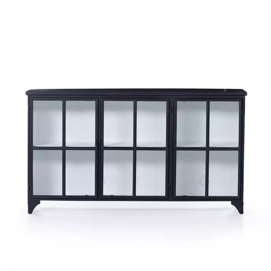 A distressed black iron frame contrasts a clean white interior. Three windowpane doors open to ample interior shelving, maximizing storage and display options. Variation from piece to piece is to be expected, and speaks to the natural allure of industrial iron.