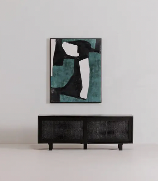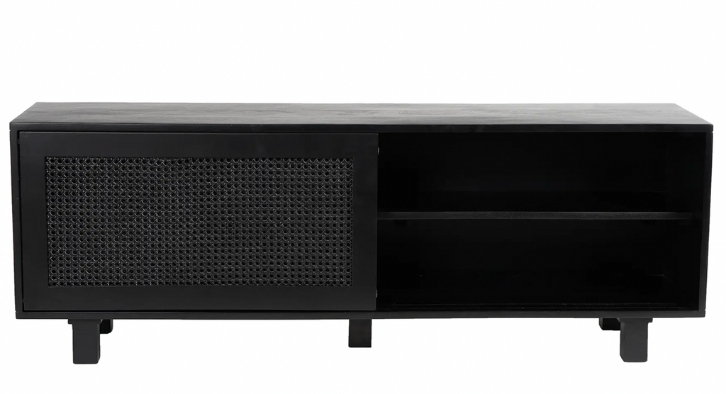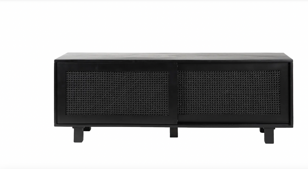 A stylish combination of solid mango wood and woven cane give the Cane Media Console a fresh contemporary style. Two black-framed doors of woven cane slide open to reveal shelving for your home media collection or sound system. The 55" width makes it suitable for a large flat screen TV.