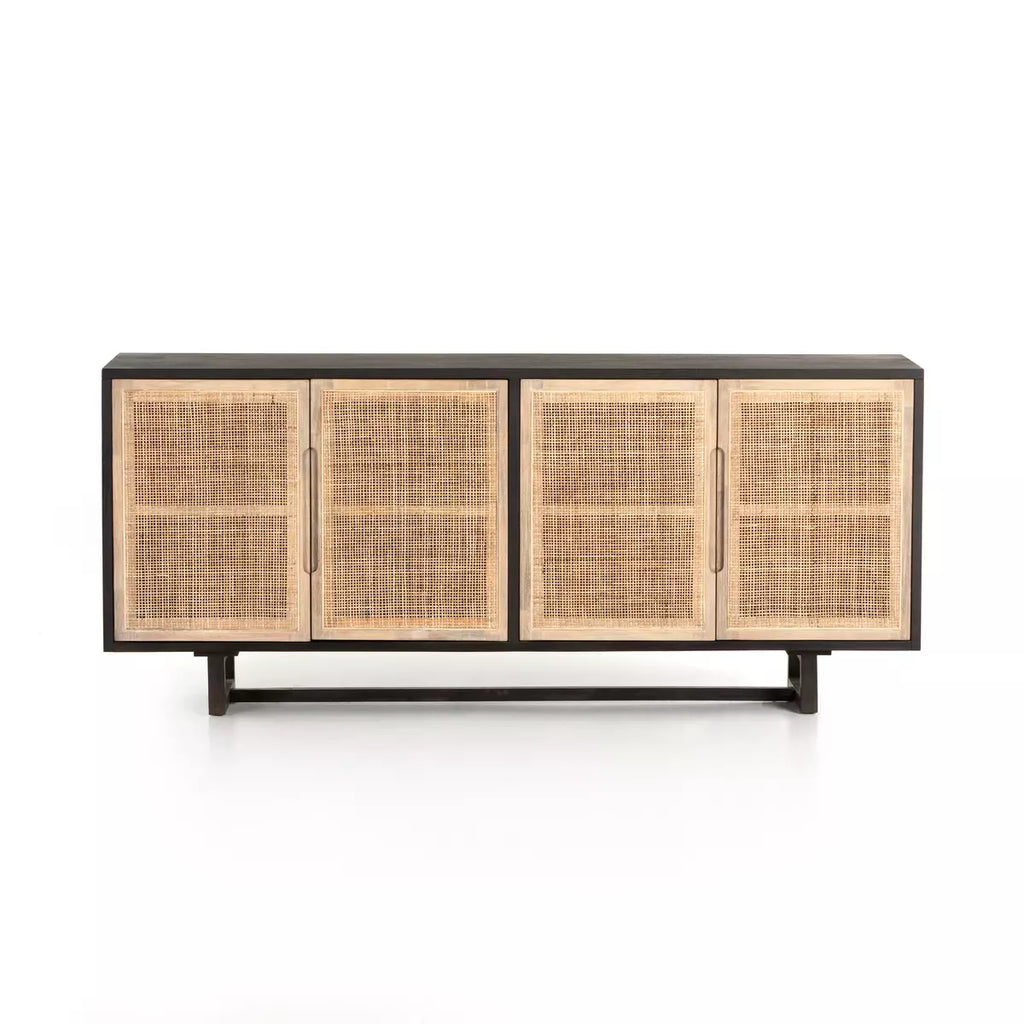 Mid century-spirited while beautifully on trend. A texture-driven sideboard of black-washed mango features white mango door fronts with natural cane paneling. Spacious interior for plenty of storage space, with adjustable shelving plus rear cutouts for cord management.