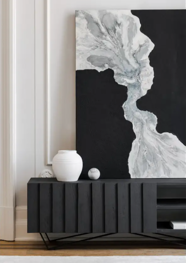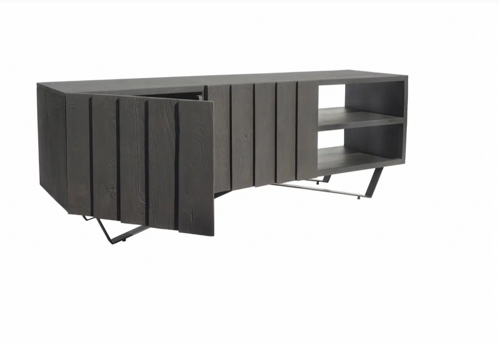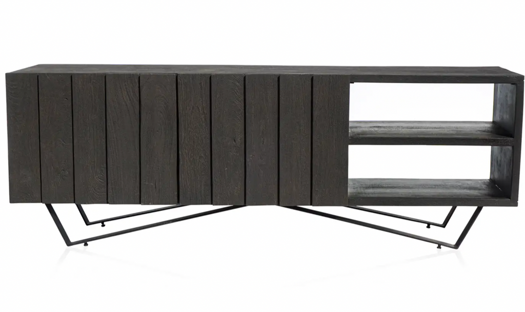 Invite darker hues and decorative introspection into your space with the Jenkins. Solid, dark-hued mango wood cuts a dramatic profile, while sturdy iron legs bring sculptural elegance to satisfy those artsy cravings. The media console’s 2 easy-open doors swing wide to reveal a spacious storage area, and its open concept shelf is a neat and convenient home for any media device. An ideal centerpiece for your entertainment setup, pair this piece with others from the Brolio collection for a complete look.