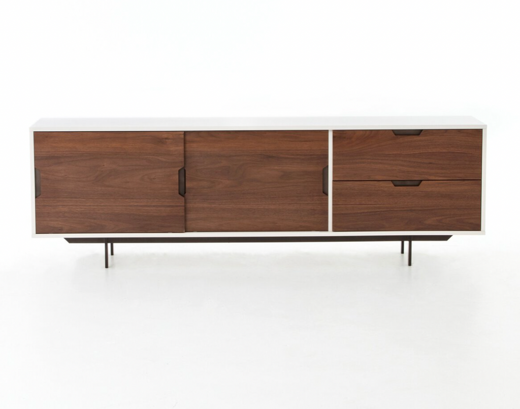 Two-tone style gets the modern-minimalist treatment. White high-gloss lacquer frames rich brown walnut for crisp, clean contrast. Drawers and slide-open shelving for spacious console storage. Four posterior cutouts for cord management.