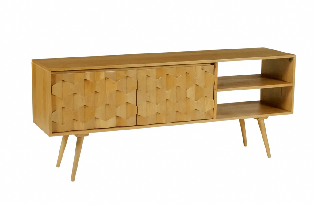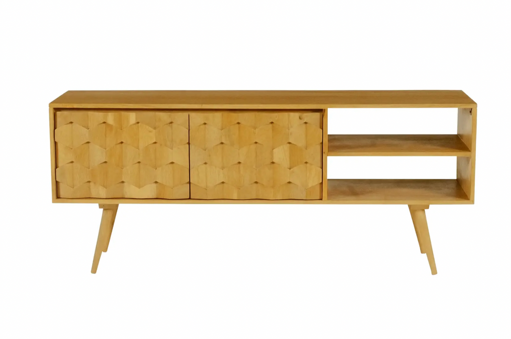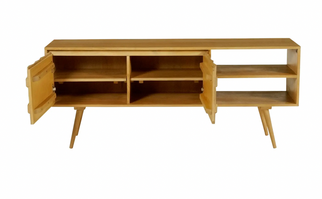 An ode to Mid-Century modern design, the O2 collection is retro and modern all at the same time. Made of beautiful mango wood with a light oak wood finish, this TV cabinet adds a pinch of personality with slim, flared legs and ample storage both covered and open. Add natural allure to any living space with this beautiful TV display.