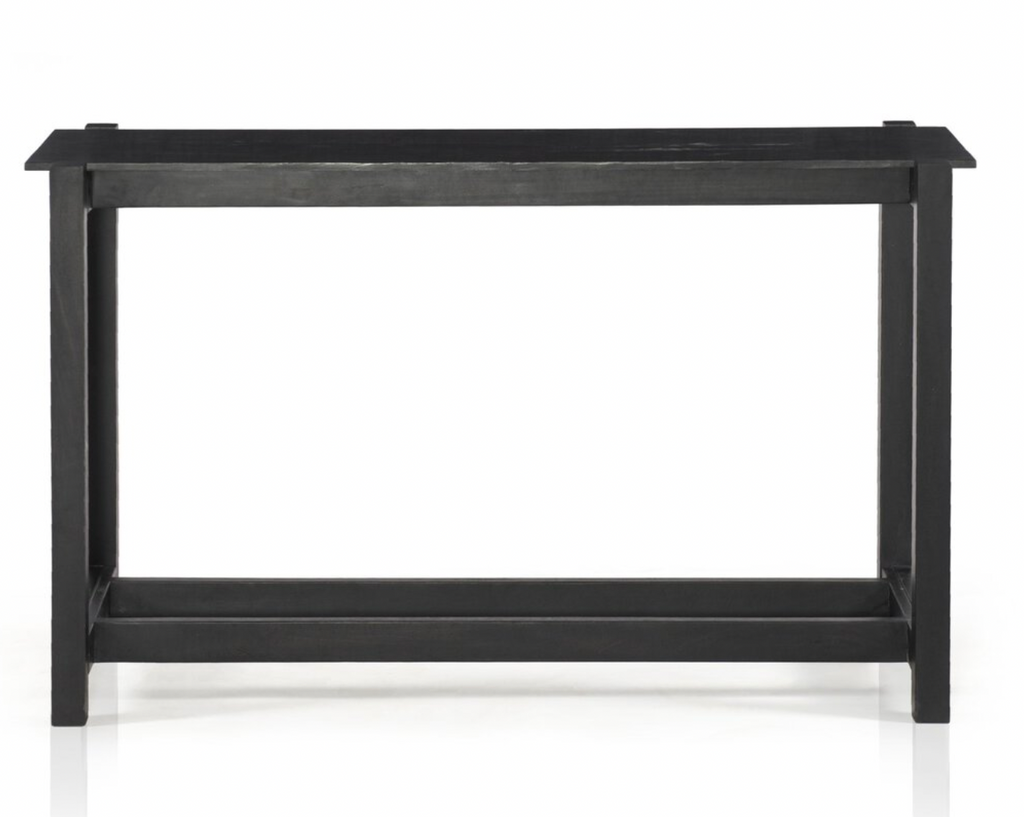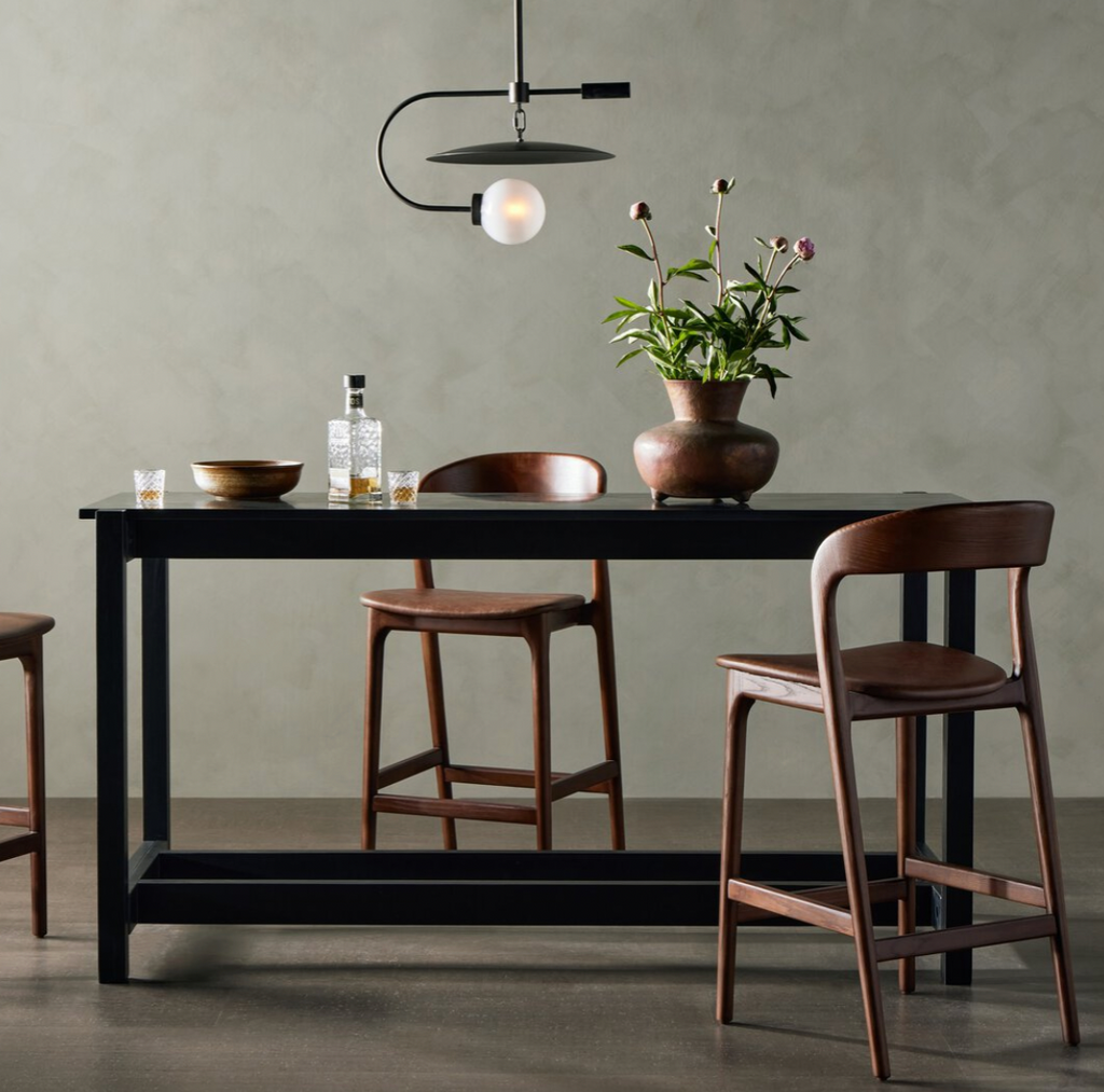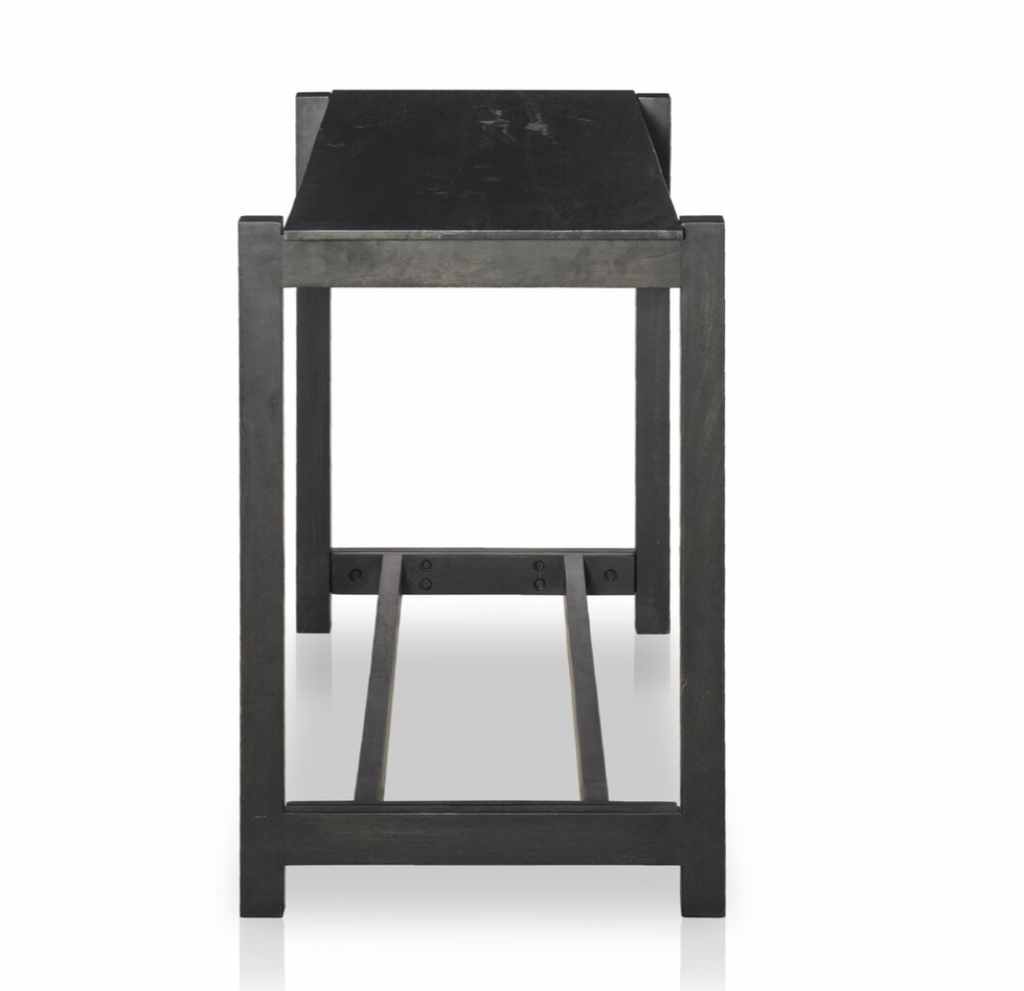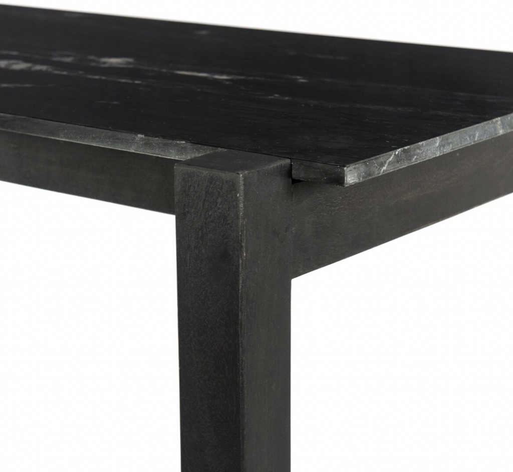 Simple and streamlined, an eye-catching material mix takes this modern counter-height table to the next level. Solid mango wood in a distressed black finish forms an open, structured frame for a rectangular tabletop of polished black marble, for a midcentury-infused twist on traditional farmhouse styling.
