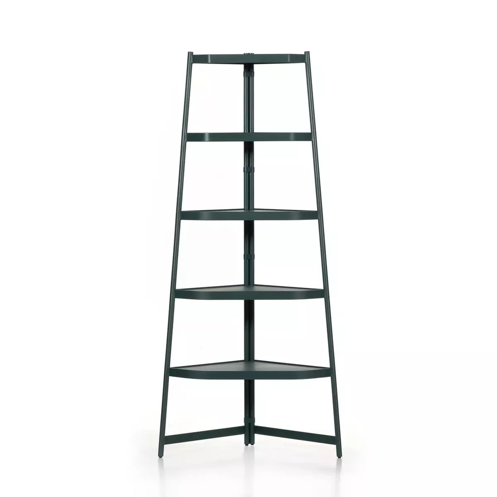 Space-saving iron shelf offers five tiers of durable storage for books and décor. Designed for corners, it's great for rooms short on space from small living areas to the bedroom and office.