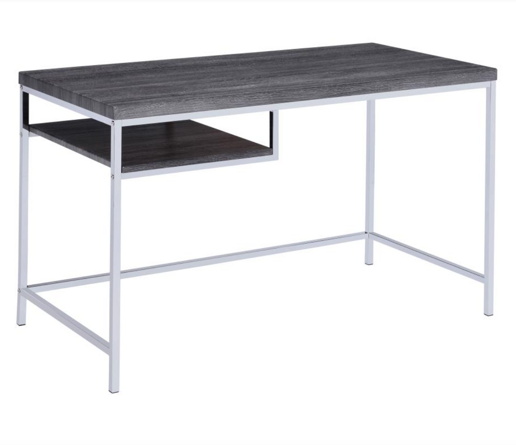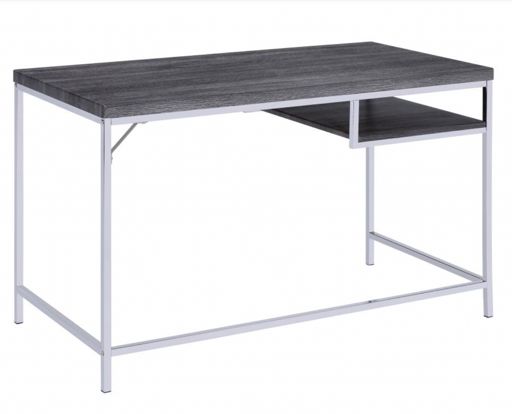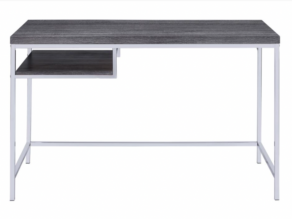 Coastal meets modern with writing desk in weathered grey finish. Metal frame in electroplated polished chrome finish. Metal, MDF, and laminate construction