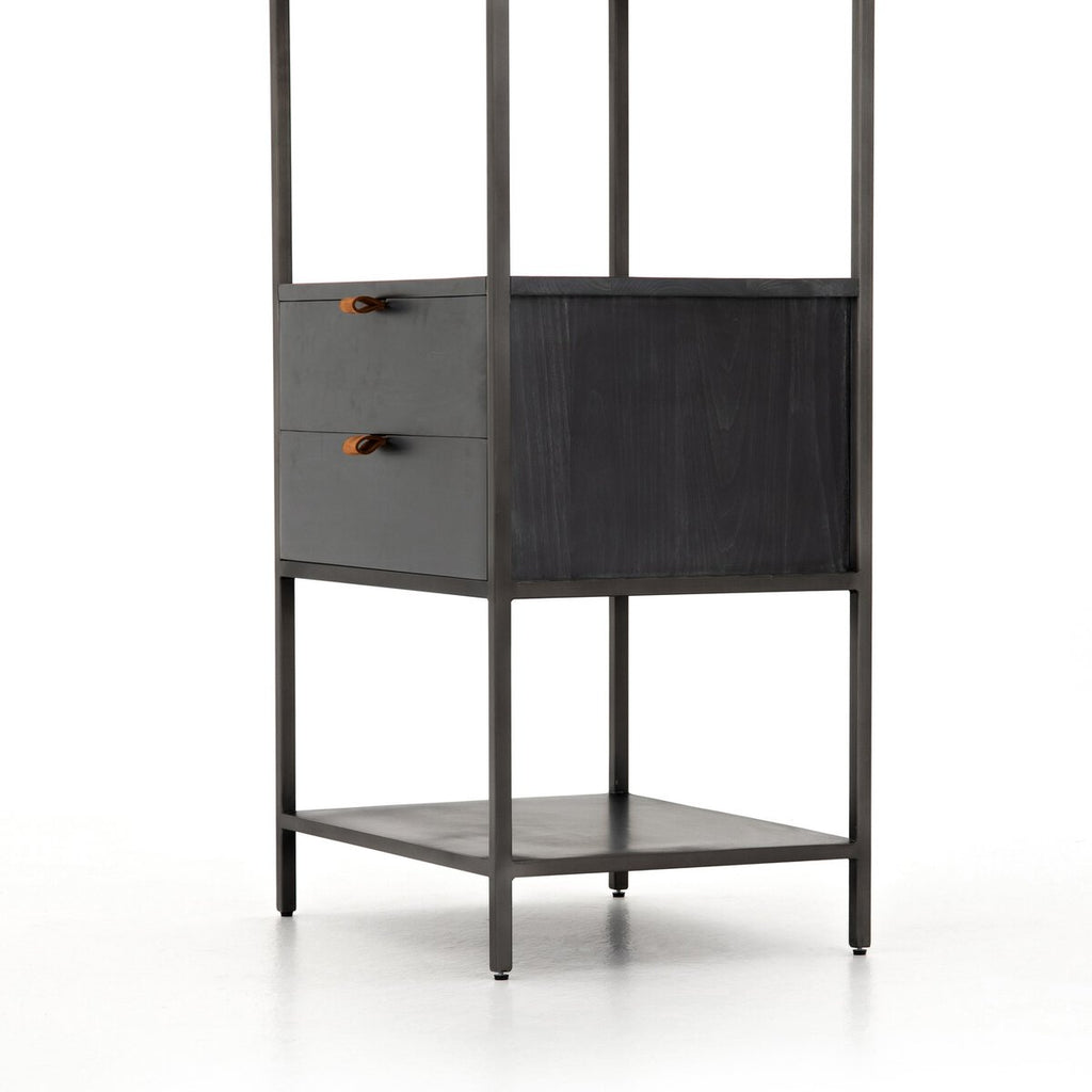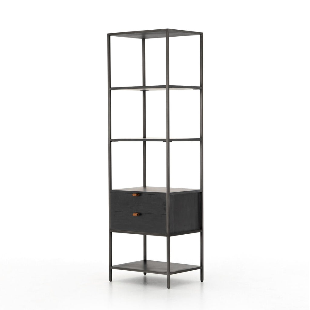 A stylish bookshelf of black-washed poplar offers ample storage space by way of open shelving and dual drawers. Metal-secured pulls of toffee top-grain leather add a textural element of surprise. Great solo, doubled, or paired with matching desk or filing