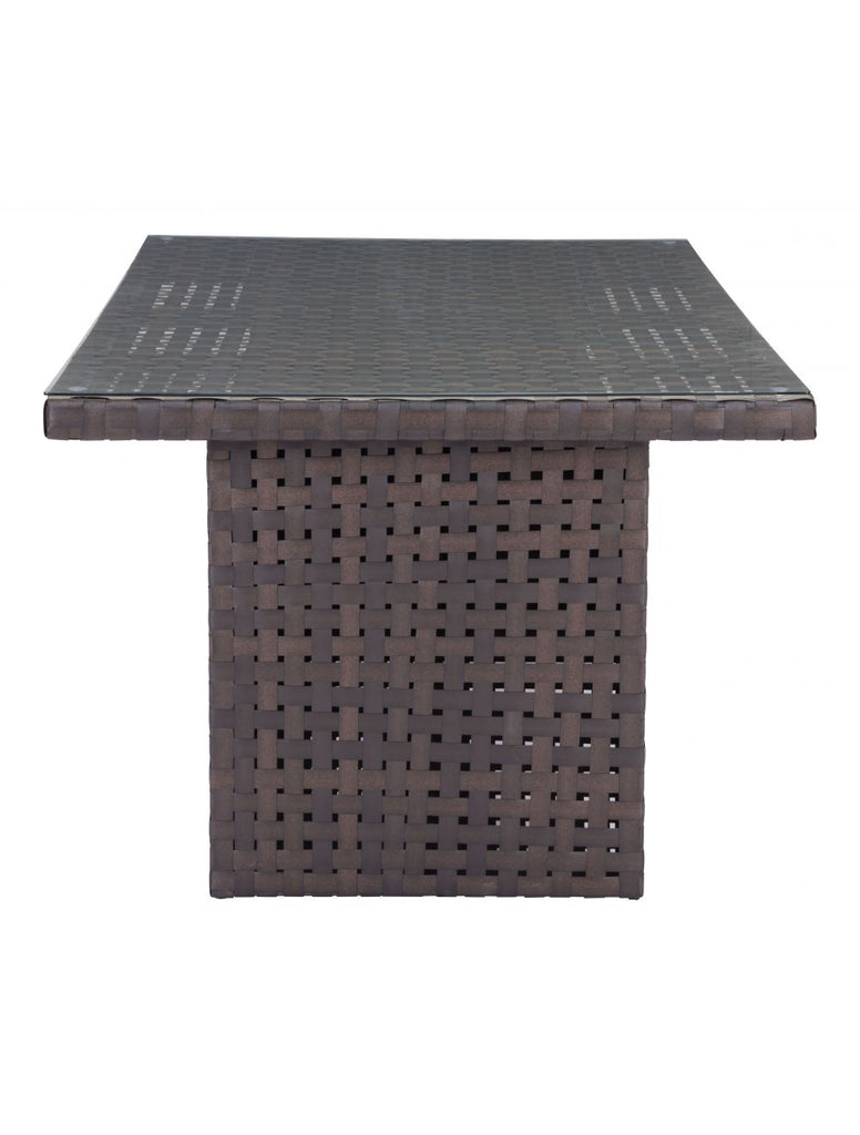 Stunning copper basket pattern synthetic weave covering a galvanized aluminum frame for a distinctive design statement with a tempered glass top.