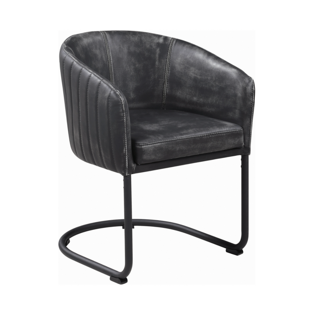 A barrel-back seat chair and a classic sled base design complete with a deep black powder-coated finish. Anthracite faux leather upholsters a plush seat and curved back to ensure elegance and comfort.