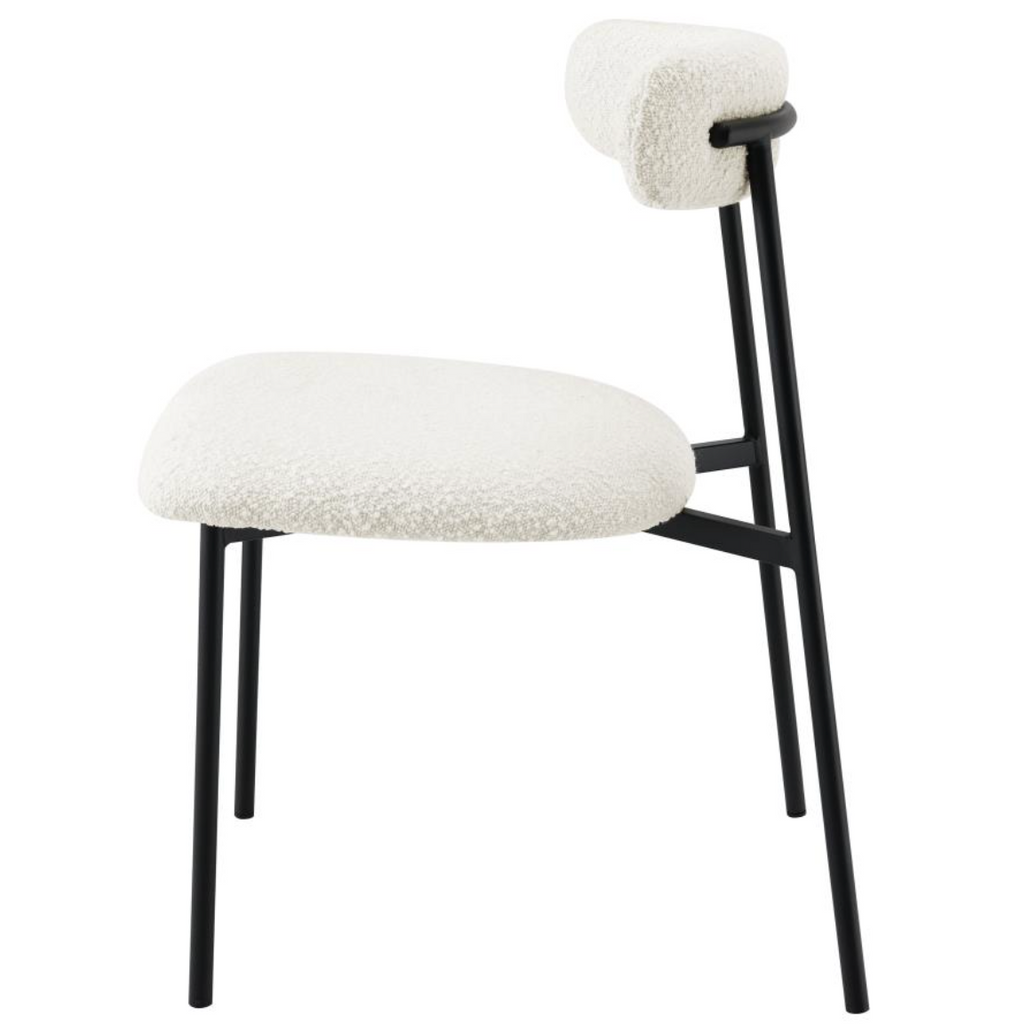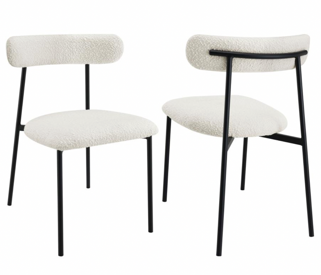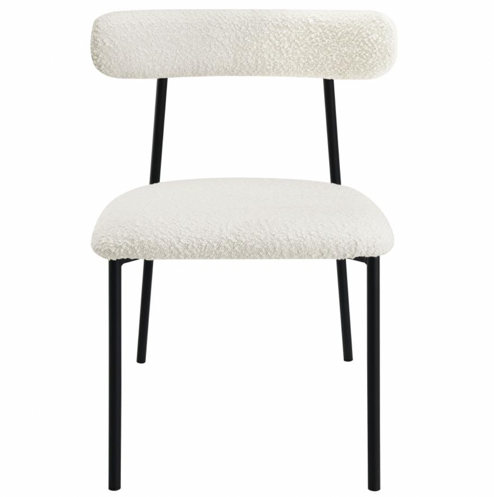 Modern, slim frame, metal construction, and plush boucle upholstery.