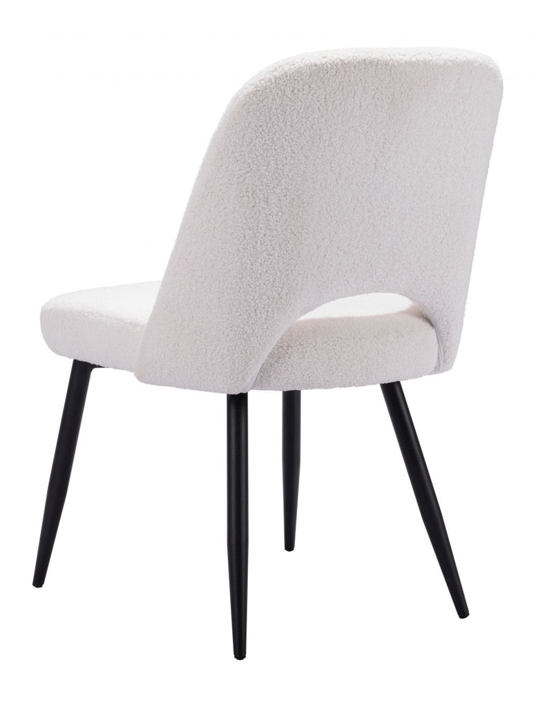 The Teddy Dining chair has powder coated steel legs and is wrapped in a soft textured faux sheep fabric. This chair has a mixture of soft boho textures with a modern shape.