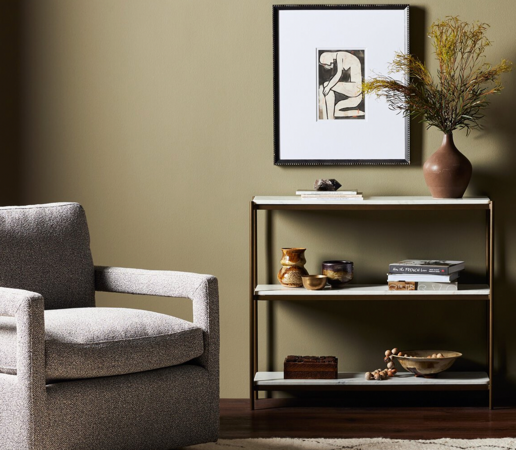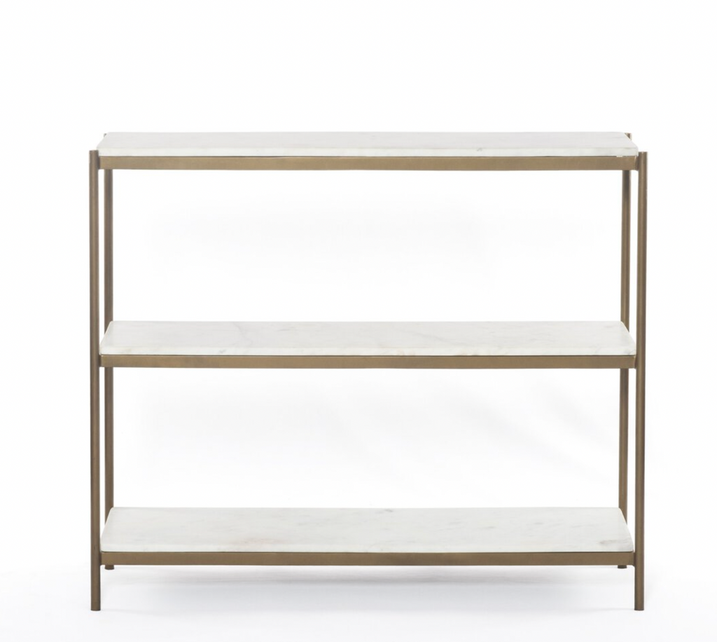 Add a pop of sophistication to any space. Polished white marble lays three tiers of smooth shelving for an open style with plenty of surface area. Antique brass framing places a feminine spin on console storage.