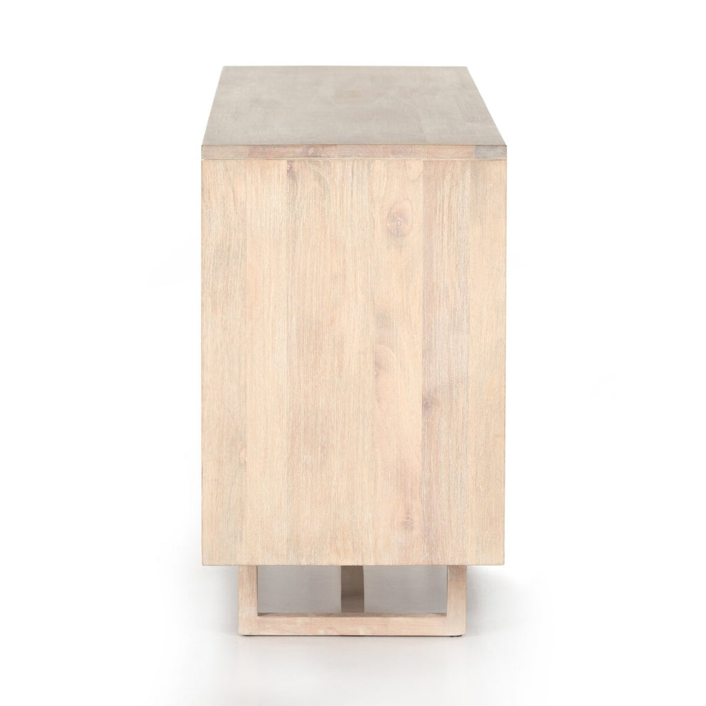 Mid century-spirited while beautifully on trend. A texture-driven sideboard of white-washed mango features door fronts with natural cane paneling. Spacious interior for plenty of storage space, with adjustable shelving plus rear cutouts for cord management.