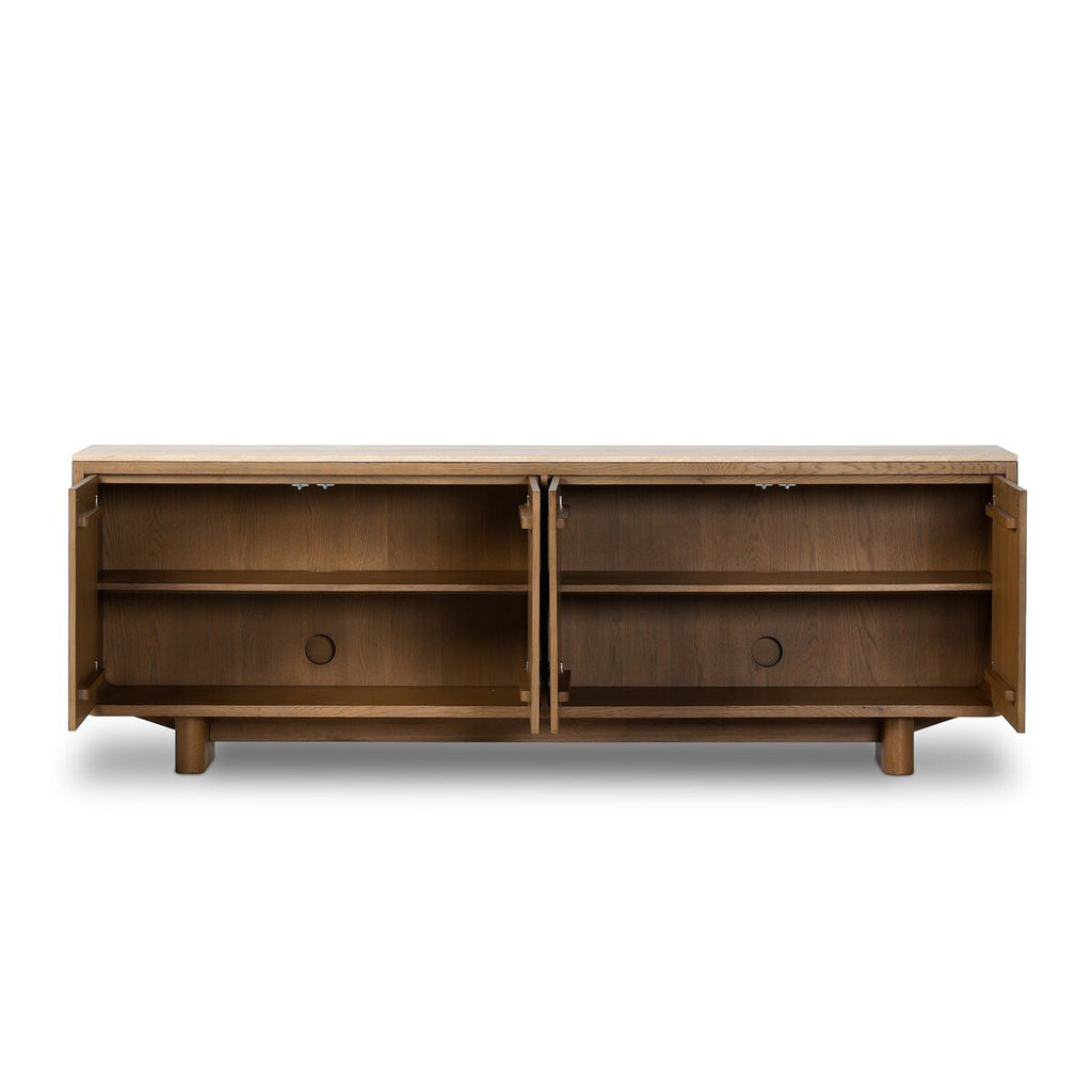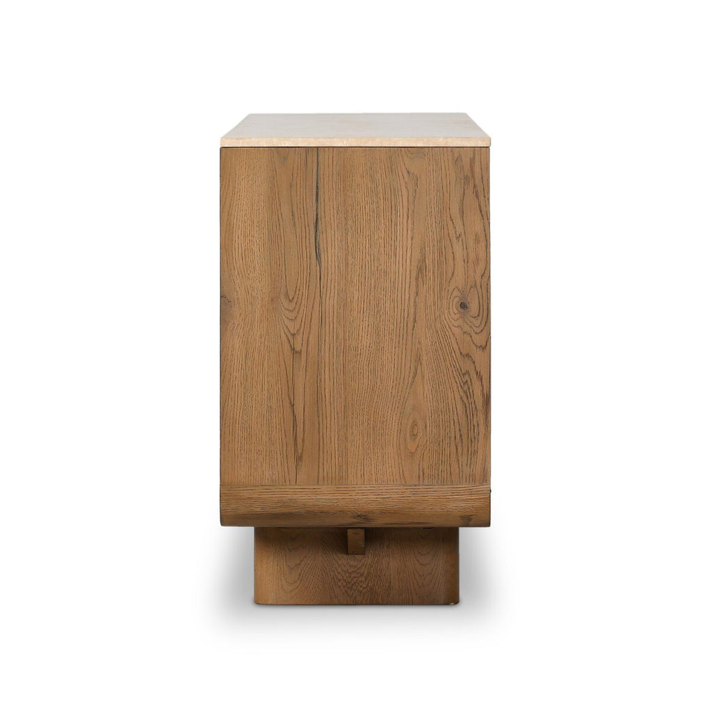 Clean, angular casing and grand scale are softened by a uniquely curved base. Rubbed light oak paired with a travertine top takes this otherwise streamlined design to the next level.