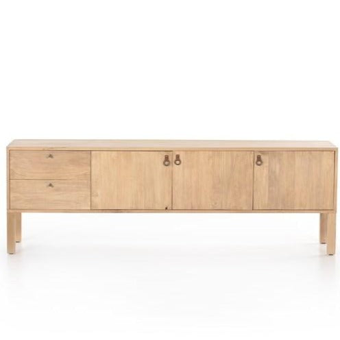 Beautifully simple in spirit. Solid dry-washed poplar forms a clean-lined media console with dovetail joinery plus iron and leather hardware, for a fresh, material-driven update to Shaker-inspired styling. Rear cutouts for cord management.