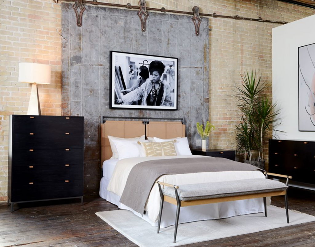 Smart in shape and style, slim-profile bench seating features solid oak framing, black-finished steel legs and soft, textural seating in a speckled black. Ideal in an entryway, living area or at the foot of the bed.