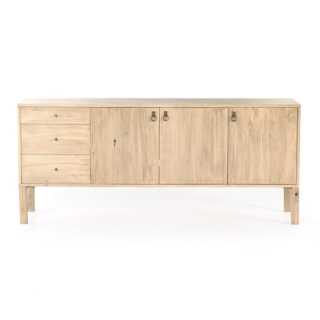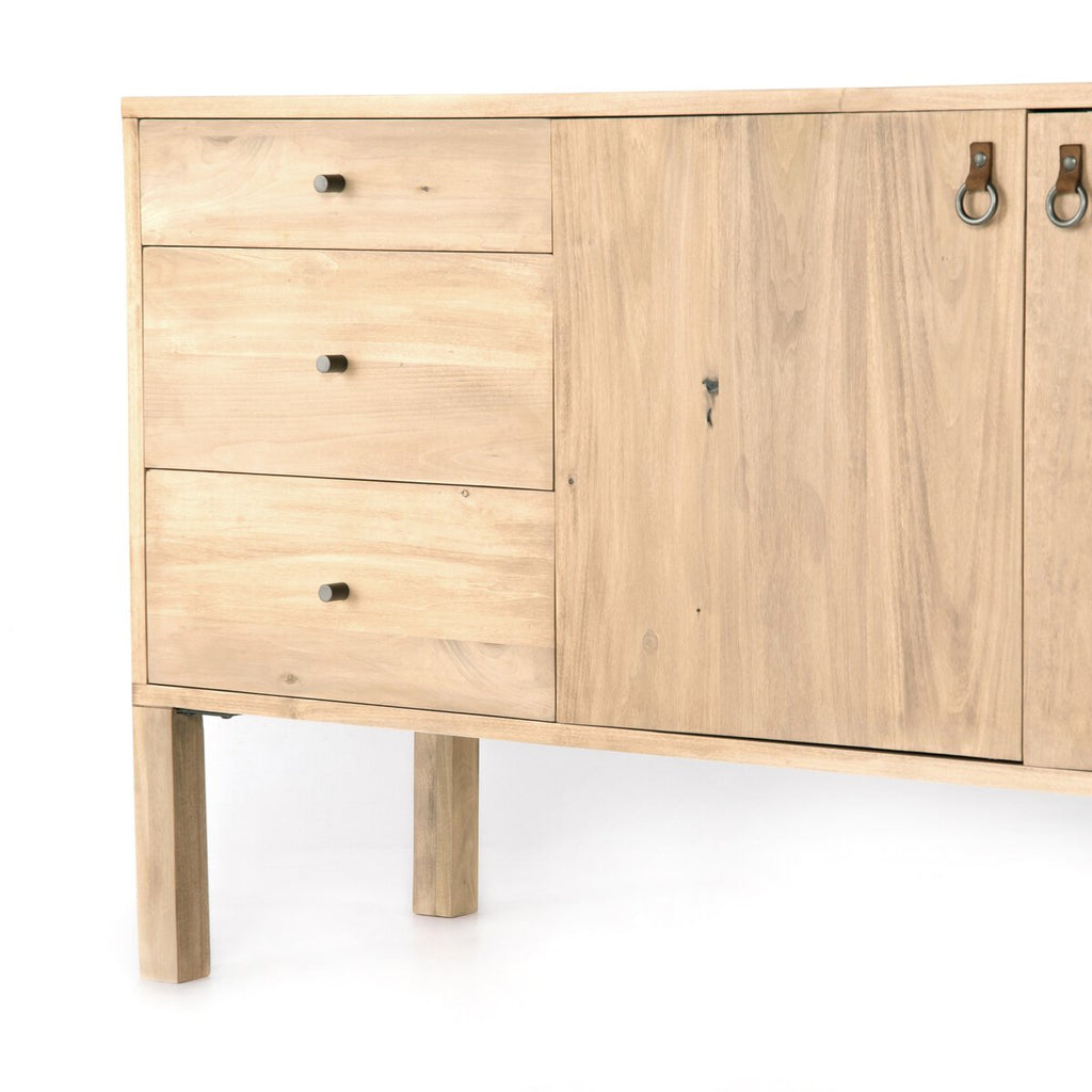 Beautifully simple in spirit. Solid dry-washed poplar forms a clean, Parsons-style sideboard with faux dovetail joinery plus iron and leather hardware, for a fresh, material-driven update to Shaker-inspired styling. Rear cutouts for cord management.