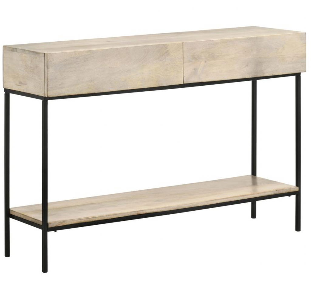 Sleek lines and contrasting finishes come together to create this contemporary console table. The top dual drawers and open bottom shelf, built of an eco-friendly mango wood in a whitewash finish, offer up ample storage space for out-of-sight items and baskets.